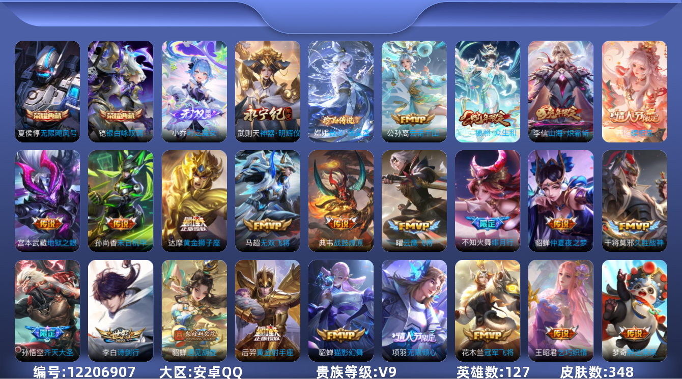 [12206907]【商品标题】:安卓Q-V9-最强王者段位-126英雄-348皮肤-2典藏-0珍品无双-2无双-1珍品传说-23传说-95史诗