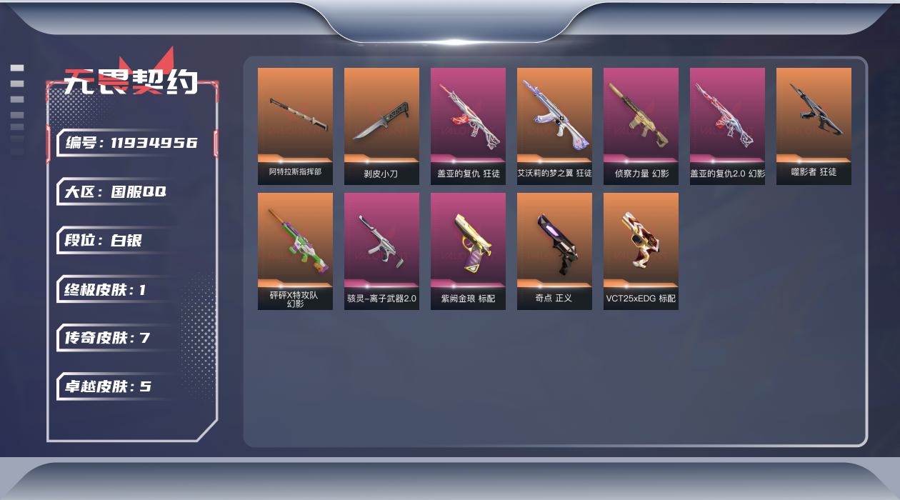[11934956]7橙皮 1金皮 5紫皮 46皮肤 16英雄 54卡面 465已用源晶 白银 优质装备:正义-奇点,狂徒-艾沃莉的梦之翼,幻影-砰砰X特攻队,狂徒-盖亚的复仇,幻影-侦察力量,幻影-盖亚的复仇2.0,标配-紫阙金琅,剥皮小刀,阿特拉斯指挥部 佩枪皮肤:标配-VCT25xEDG 冲锋枪皮肤:骇灵-离子武器2.0 步枪皮肤:狂徒-噬影者
