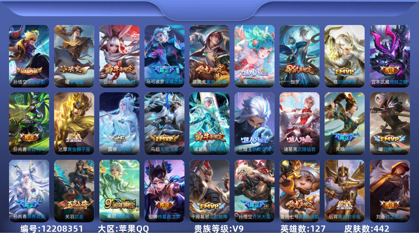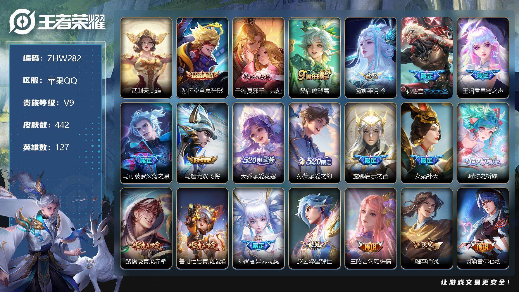 [12208351]【特价急出/详情看图】:苹果Q-V9-永恒钻石II段位-127英雄-442皮肤-1典藏-42传说-141史诗 【荣耀典藏】:武则天英雄,孙悟空全息碎影 【传说皮肤】:干将莫邪千山共赴,桑启鸣野蒿,露娜霜月吟,孙悟空齐天大圣,王昭君星穹之声,马可波罗深海之息,马超无双飞将,大乔挚爱花嫁,孙策挚爱之约,露娜启示之音,女娲补天,瑶时之祈愿,裴擒虎寅虎赤拳,鲁班七号寅虎瑞焰,孙尚香异界灵契,赵云淬星耀世,王昭君乞巧织情,曜李逍遥 ,周瑜音你心动,小乔音你心动,兰陵王默契交锋,公孙离祈雪灵祝,诸葛亮时雨天司,铠绛天战甲,镜炽阳神光,虞姬启明星使,孙悟空零号赤焰,关羽武圣,曜云鹰飞将,刘备时之恋人,伽罗太华,貂蝉猫影幻舞,干将莫邪久胜战神,达摩黄金狮子座,后羿黄金射手座,诸葛亮武陵仙君,貂蝉仲夏夜之梦,孙尚香末日机甲,宫本武藏地狱之眼,孙悟空地狱火,武则天海洋之心,狄仁杰超时空战士 【限定皮肤】:大乔绒语心约,姜子牙天穹之誓,狄仁杰阴阳师,廉颇寅虎御盾,赵云皇家上将,赵云百木心枪,墨子神迹守卫,墨子降魔,嬴政白昼王子,孙尚香蔷薇恋人,孙尚香异界灵契,鲁班七号狮舞东方,鲁班七号乒乒小将,鲁班七号寅虎瑞焰,庄周高山流水,高渐离玩趣恶龙,钟无艳超时空战士,孙膑天狼运算者,孙膑寅虎展翼,扁鹊奇幻香踪,白起夜都怪侠,芈月幻夜卜梦,吕布猎兽之王,吕布御风骁将,元歌云间偶戏,元歌无心,夏侯惇朔风刀,夏侯惇匿光决锋者,甄姬女儿国国王,甄姬游园惊梦,甄姬落雪兰心,典韦蓝屏警告,典韦岱宗,马可波罗暗影游猎,马可波罗深海之息,狄仁杰魔术师,狄仁杰万华元夜,达摩星际陆战队,达摩沙漠行僧,项羽海滩派对,项羽霸王别姬,老夫子醍醐杖,老夫子航海奇遇记,关羽冰锋战神,关羽武圣,程咬金演武夺筹,露娜一生所爱,露娜启示之音,刘邦夺宝奇兵,韩信逐梦之影,韩信傲雪梅枪,王昭君午后时光,王昭君星穹之声,兰陵王默契交锋,兰陵王金庭之子,花木兰青春决赛季,花木兰默契交锋,亚瑟潮玩骑士王,孙悟空美猴王,孙悟空零号赤焰,孙悟空孙行者,孙悟空齐天大圣,牛魔御旌,牛魔奔雷神使,后羿如梦令,后羿圣弓游侠,李元芳云中旅人,虞姬霸王别姬,虞姬启明星使,钟馗神迹守卫,钟馗驱傩正仪,杨玉环遇见飞天,杨玉环寅虎心曲,杨戬潮玩骑兵,女娲朔望之晖,女娲补天,干将莫邪冰霜恋舞曲,干将莫邪真爱魔法,雅典娜单词大作战,蔡文姬繁星吟游,东皇太一逐梦之光