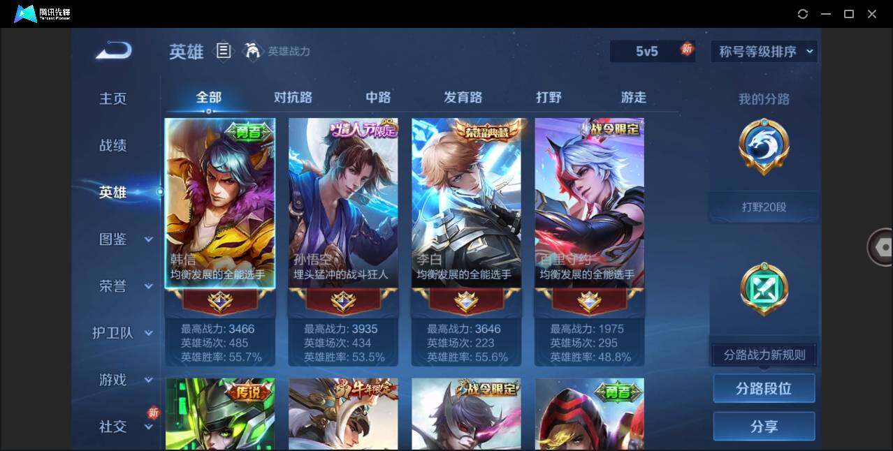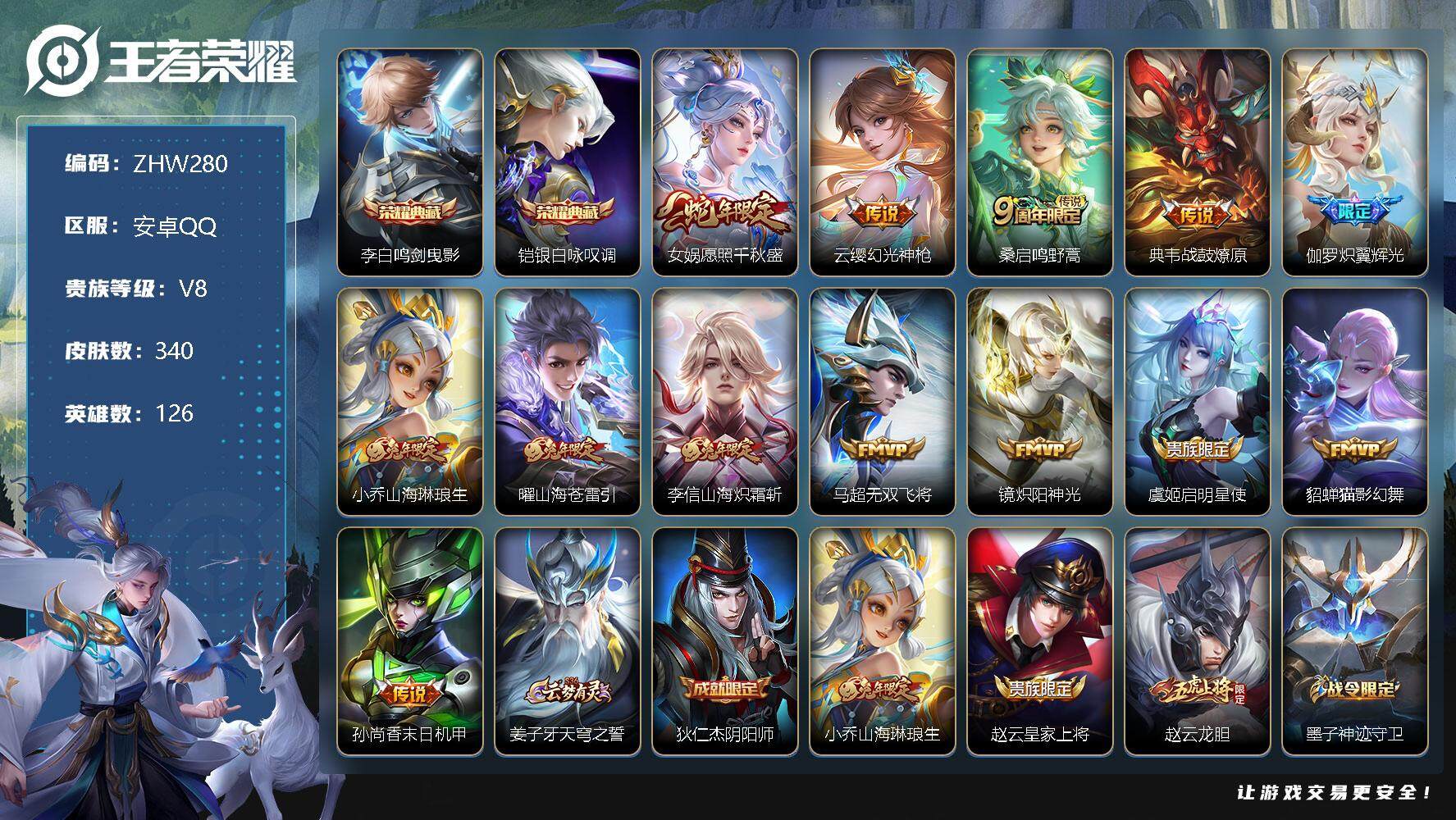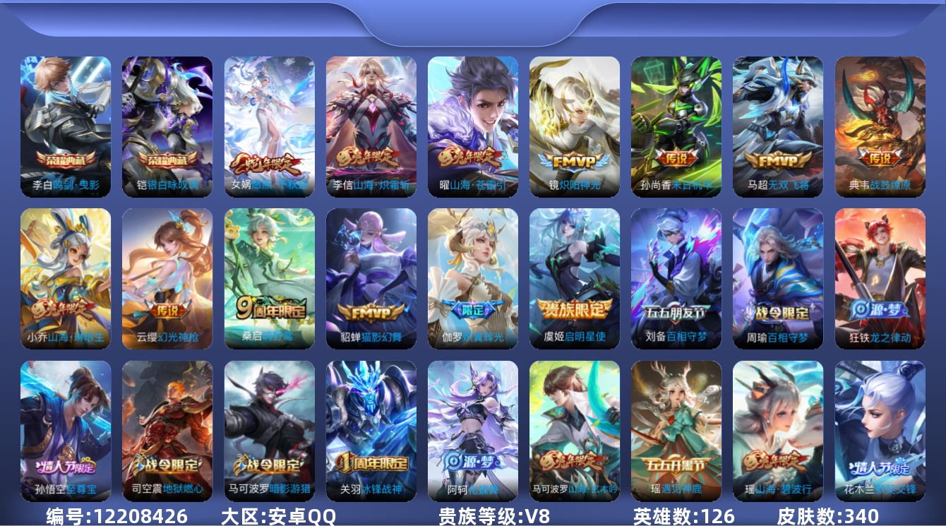 [12208426]【特价急出/详情看图】:安卓Q-V8-至尊星耀V段位-126英雄-340皮肤-2典藏-13传说-94史诗