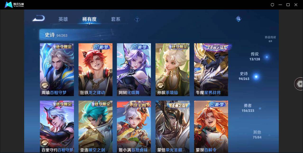 - [12253927]V10 6典藏 1珍品传说 27传说 126英雄 354皮肤 典藏英雄武则天 可修改实名 优质装备:天鹅之梦(小乔典藏),星空梦想(太空人),无限飓风号(高达),杀手不太冷,鸣剑·曳影,全息碎影(猴子典藏),怪盗基德,黄金狮子座,黄金射手座,冠军飞将,云鹰飞将(小将军),绛天战甲(鸡嘴战神),黄金白羊座,猫影幻舞,久胜战神,炽阳神光,一念神魔,云霓雀翎,末日机甲-孙尚香(绿蚂蚱),地狱火,仲夏夜之梦(大飞蛾),零号·赤焰,海洋之心,地狱之眼,胖达荣荣,时之恋人-刘备(电焊工),超时空战士-狄仁杰,艾琳觅芳踪 珍宝阁皮:优雅恋人,女武神 限定皮:鸣野蒿,至尊宝,太华(伽罗年限),傲雪梅枪,白鹤梁神女,白晶晶,时雨天司(水龙头),神威(电光马子),遇见飞天,高山流水,五谷丰年,冰锋战神,游园惊梦,梁祝,御风骁将(吕布年限),逐梦之星,天狼溯光者,奔雷神使(牛魔年限),祈雪灵祝(雪兔子),李小龙,逐梦之影,默契交锋-兰陵王,默契交锋-花木兰,猪悟能,大圣娶亲,乒乒小将 史诗皮:灵蛊蚀心,龙之律动,百相守梦-百里守约,遇见神鹿,紫霞仙子,电玩小子(小书包),白龙吟,黄金分割率,特工魅影,千年之狐,江河有灵,魅语,无限星赏官,冰冠公主,青蛇,偶像歌手,白蛇,晚萤,电玩·爆裂旋风,暗夜猫娘,龙骑士(小龙虾),末日机甲-吕布,猫狗日记-孙策,猫狗日记-大乔,乱世虎臣,节奏热浪,修罗,女仆咖啡,摇滚巨星,水果甜心,绅士熊喵,天才门将,星夜王子,心灵骇客,时之奇旅-安琪拉,功夫厨神,德古拉伯爵,暗隐猎兽者,幽灵船长,鬼剑武藏,暗渊魔法,心灵战警,天秀·启明,舞动绿茵,地狱岩魂,诗语江南,繁星吟游(呼啦呼啦),拒霜思,缤纷独角兽,乘风破浪,逐浪之夏,月团寄思,水晶猎龙者,曙光守护者,箭羽风息,金属风暴,原初追逐者,圣诞狂欢,圣诞恋歌,鹰眼统帅,暗夜贵公子,魅力维加斯,黎明之约,未来纪元-赵云