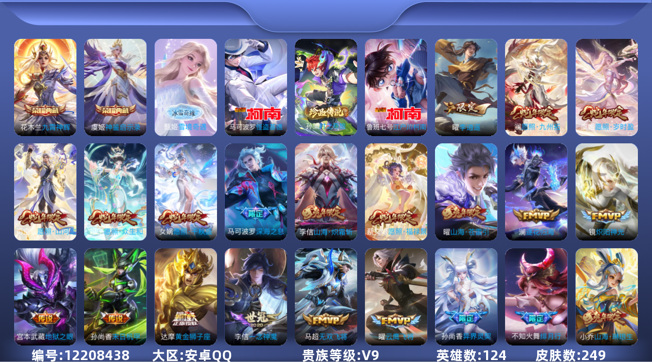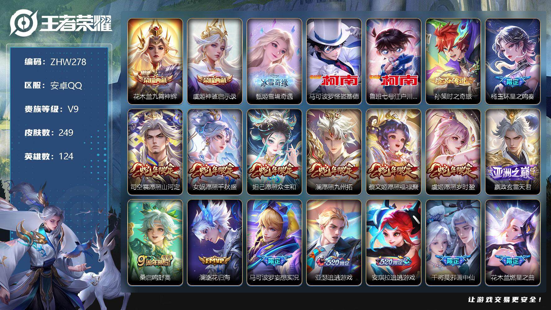 [12208438]【特价急出/详情看图】:安卓Q-V9-荣耀黄金III段位-124英雄-249皮肤-2典藏-1无双-3珍品传说-50传说-76史诗 【荣耀典藏】:花木兰九霄神辉,虞姬神鉴启示录 【无双皮肤】:甄姬雪境奇遇 【珍品传说】:马可波罗怪盗基德,鲁班七号江户川柯南,孙策时之奇旅 【传说皮肤】:杨玉环星之鸣奏,司空震愿照山河定,女娲愿照千秋盛,妲己愿照众生和,澜愿照九州拓,蔡文姬愿照福禄聚,虞姬愿照岁时盈,嬴政玄雷天君,桑启鸣野蒿,澜逐花归海,马可波罗妄想实况,亚瑟追逃游戏,安琪拉追逃游戏,干将莫邪画中仙,花木兰燃星之曲,虞姬无限倾心,项羽无限倾心,伽罗炽翼辉光,孙悟空齐天大圣,小乔山海琳琅生,曜山海苍雷引,李信山海炽霜斩,吕布怒海麟威,李白诗剑行,狄仁杰神器狴犴令,不知火舞绯月行,王昭君星穹之声,孙尚香音你闪耀,马可波罗深海之息,后羿无尽星芒,马超无双飞将,孙策挚爱之约,孙尚香异界灵契,曜李逍遥 ,周瑜音你心动,李元芳飞鸢探春,铠绛天战甲,镜炽阳神光,虞姬启明星使,曜云鹰飞将,李信一念神魔,刘备时之恋人,貂蝉猫影幻舞,虞姬云霓雀翎,达摩黄金狮子座,后羿黄金射手座,孙尚香末日机甲,宫本武藏地狱之眼,孙悟空地狱火,狄仁杰超时空战士 【限定皮肤】:李白谪仙醉月,狄仁杰阴阳师,小乔山海琳琅生,赵云皇家上将,赵云龙胆,墨子降魔,妲己时之奇旅,孙尚香异界灵契,庄周玄嵩,钟无艳超时空战士,孙膑天狼运算者,白起夜都怪侠,元歌无心,夏侯惇匿光决锋者,甄姬幽恒,甄姬落雪兰心,典韦岱宗,马可波罗暗影游猎,马可波罗深海之息,马可波罗山海玄木吟,马可波罗妄想实况,狄仁杰魔术师,狄仁杰万华元夜,狄仁杰神器狴犴令,项羽海滩派对,项羽无限倾心,安琪拉追逃游戏,韩信飞衡,王昭君午后时光,王昭君星穹之声,兰陵王金庭之子,花木兰燃星之曲,不知火舞绯月行,亚瑟追逃游戏,孙悟空孙行者,孙悟空齐天大圣,后羿辉光之辰,后羿圣弓游侠,后羿无尽星芒,张飞虎魄,李元芳银河之约,李元芳云中旅人,虞姬启明星使,虞姬无限倾心,杨戬潮玩骑兵,干将莫邪画中仙,鬼谷子五谷丰年,大乔白鹤梁神女,黄忠烈魂,沈梦溪大漠名商,沈梦溪匿光破解者,明世隐吟游魔法,裴擒虎擒涛扼浪,狂铁电玩高手,瑶山海碧波行,云中君时之祈愿,李信山海炽霜斩,伽罗炽翼辉光,盾山梦圆繁星,孙策挚爱之约,上官婉儿神器万象笔,嫦娥暖冬兔眠,曜李逍遥 ,曜山海苍雷引,鲁班大师匿