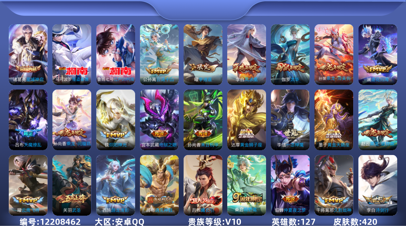 [12208462]【特价急出/详情看图】:安卓Q-V10-永恒钻石IV段位-127英雄-420皮肤-1典藏-2珍品传说-41传说-130史诗