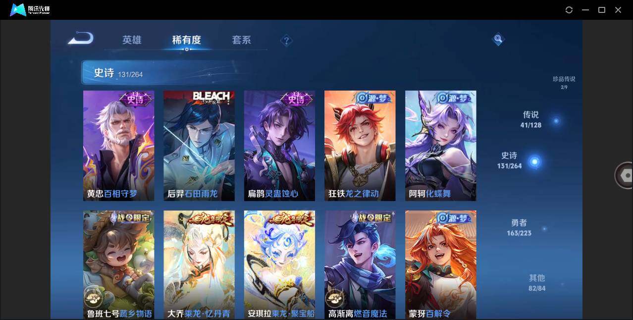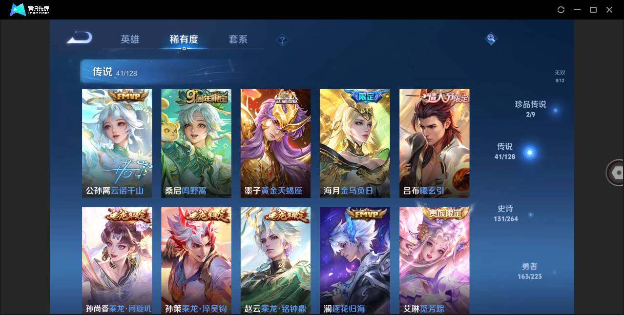 - PX_2106926-【小国标云缨】实名: 可修改 贵族等级: V10 英雄数: 124 皮肤数: 450 荣耀水晶: 武则天,天鹅之梦,星空梦想,倪克斯神谕,活力突击,九霄神辉,赤影疾锋 无双皮: 花合斗,离恨烟 珍品传说: 江户川柯南,怪盗基德,兔狲·蓬尾 星传说: 未来机甲,金色仲夏夜 传说皮: 黄金狮子座,黄金白羊座,猫影幻舞,久胜战神,炽阳神光,末日机甲-孙尚香,仲夏夜之梦,飞鸢探春,胖