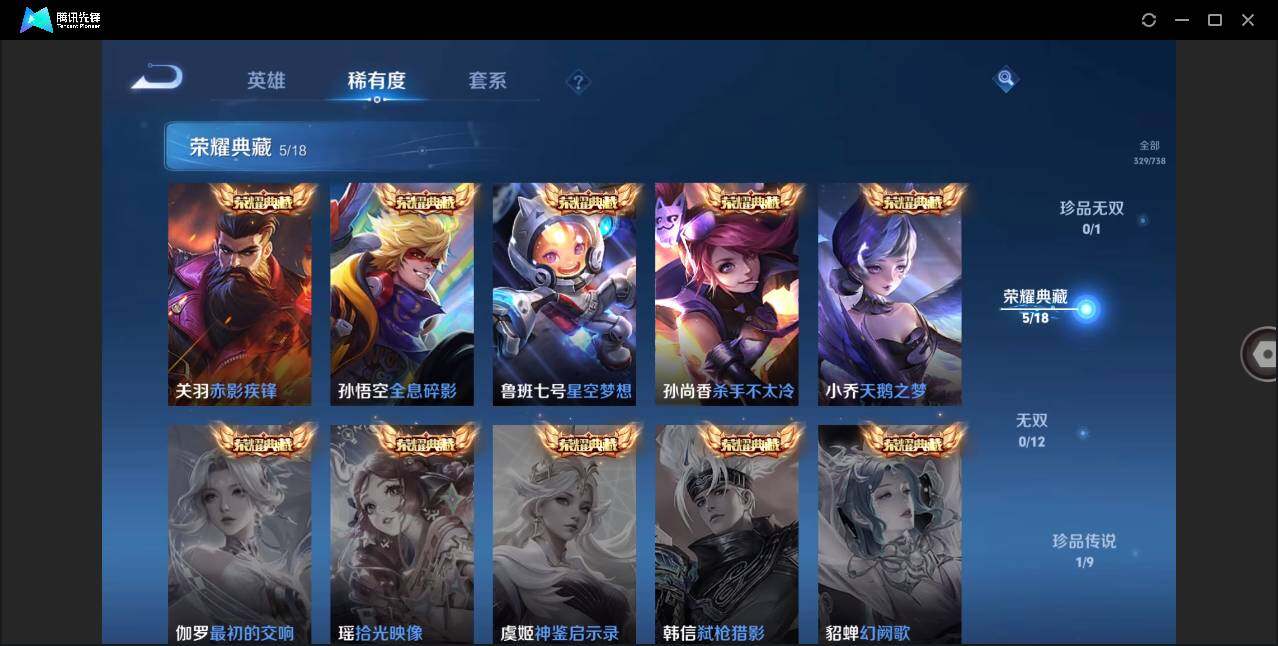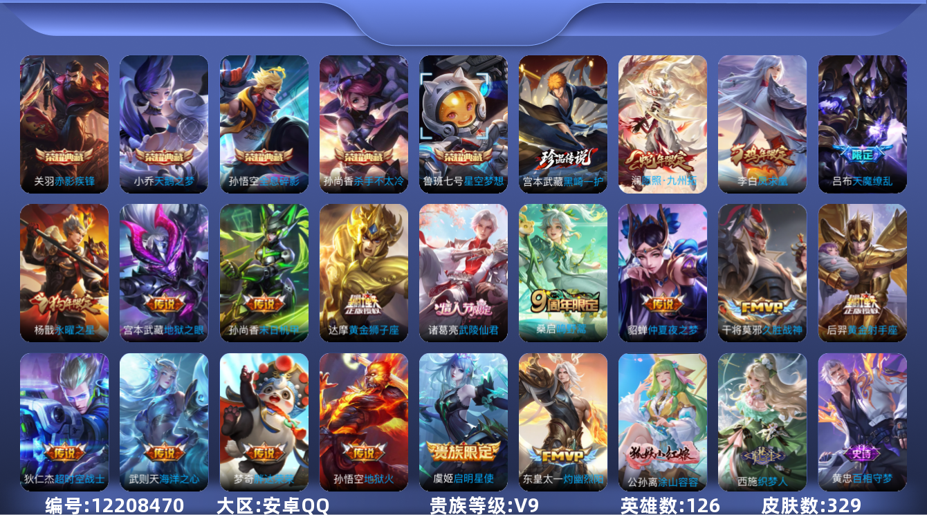[12208470]【特价急出/详情看图】:安卓Q-V9-至尊星耀I段位-126英雄-329皮肤-5典藏-1珍品传说-18传说-80史诗