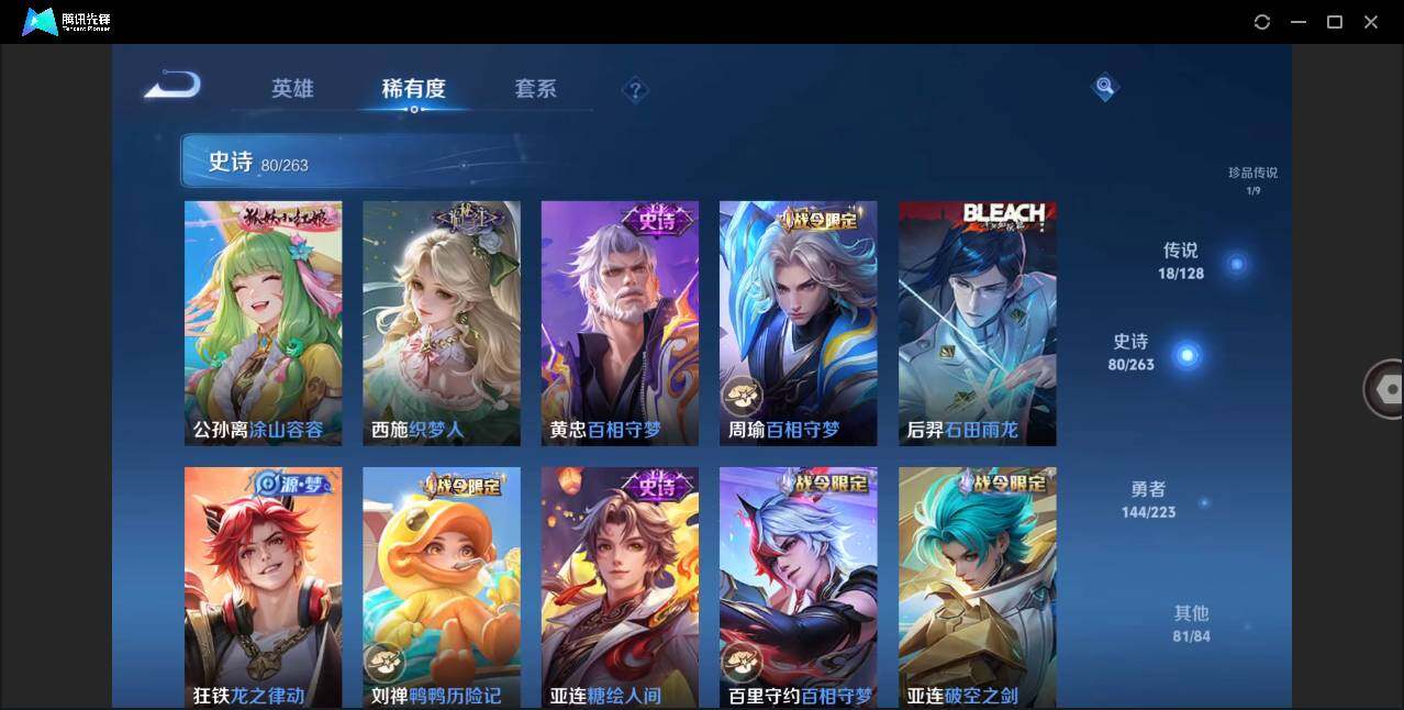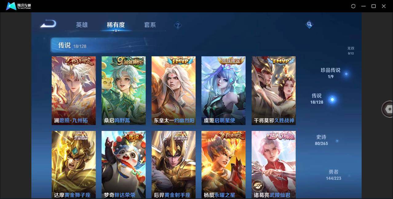 - [11658302]V6 1典藏 1珍品传说 2传说 123英雄 204皮肤 可修改实名 金蝉小国标 荣耀水晶:星域神启(倪克斯贼亮) 珍品传说:怪盗基德 传说皮:冠军飞将 珍宝阁皮:万物之道,蔷薇恋人 限定皮:逐霄战戟,鸣野蒿,遇见飞天,高山流水,五谷丰年,梁祝,孙行者,一生所爱,大圣娶亲 史诗皮:星界战将,器灵·浮梦炉,破空之剑,紫霞仙子,白龙吟,黄金分割率,千年之狐,江河有灵,蒙恬荣光圣徽,冰冠公主,魅语,末日机甲-吕布,乱世虎臣,女仆咖啡,摇滚巨星,水果甜心,天才门将,星夜王子,心灵骇客,时之奇旅-安琪拉,功夫厨神,暗隐猎兽者,幽灵船长,鬼剑武藏,心灵战警,舞动绿茵,缤纷独角兽,逐浪之夏,水晶猎龙者,金属风暴,原初追逐者,圣诞恋歌,鹰眼统帅,魅力维加斯,黎明之约,无心