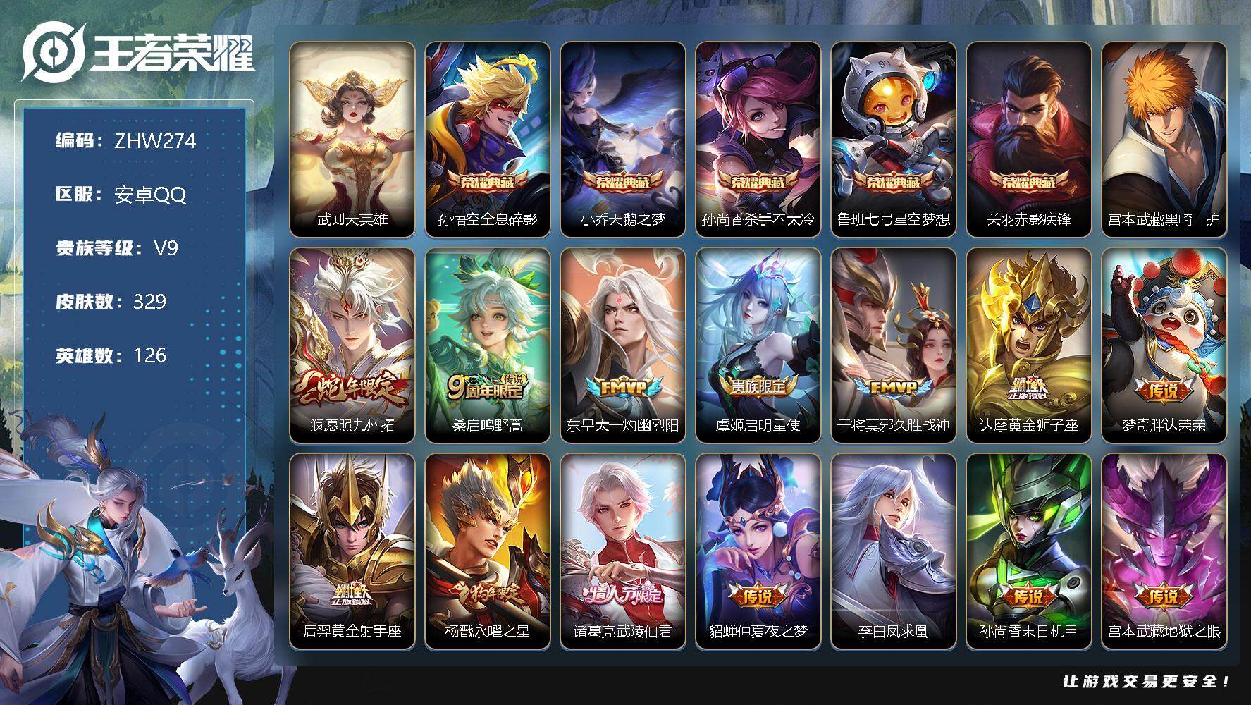 [12208470]【特价急出/详情看图】:安卓Q-V9-至尊星耀I段位-126英雄-329皮肤-5典藏-1珍品传说-18传说-80史诗 【荣耀典藏】:武则天英雄,孙悟空全息碎影,小乔天鹅之梦,孙尚香杀手不太冷,鲁班七号星空梦想,关羽赤影疾锋 【珍品传说】:宫本武藏黑崎一护 【传说皮肤】:澜愿照九州拓,桑启鸣野蒿,东皇太一灼幽烈阳,虞姬启明星使,干将莫邪久胜战神,达摩黄金狮子座,梦奇胖达荣荣,后羿黄金射手座,杨戬永曜之星,诸葛亮武陵仙君,貂蝉仲夏夜之梦,李白凤求凰,孙尚香末日机甲,宫本武藏地狱之眼,孙悟空地狱火,吕布天魔缭乱,武则天海洋之心,狄仁杰超时空战士 【限定皮肤】:白起狰,蔡文姬夏日便利店,虞姬夏日便利店,姜子牙天穹之誓,狄仁杰阴阳师,虞姬凯尔特女王,赵云皇家上将,庄周蜃楼王,庄周云端筑梦师,庄周高山流水,高渐离死亡摇滚,阿轲迷踪丽影,钟无艳王者之锤,孙膑妖精王,扁鹊炼金王,芈月重明,吕布天魔缭乱,元歌无心,夏侯惇朔风刀,甄姬游园惊梦,曹操烛龙,典韦穷奇,马可波罗逐梦之星,狄仁杰魔术师,狄仁杰万华元夜,达摩沙漠行僧,项羽海滩派对,项羽霸王别姬,老夫子圣诞老人,老夫子醍醐杖,关羽冰锋战神,貂蝉逐梦之音,程咬金演武夺筹,韩信逐梦之影,兰陵王金庭之子,花木兰青春决赛季,孙悟空美猴王,牛魔御旌,后羿辉光之辰,李元芳云中旅人,虞姬启明星使,钟馗驱傩正仪,杨玉环遇见飞天,杨戬永曜之星,雅典娜黎明之约,蔡文姬繁星吟游,太乙真人饕餮,鬼谷子原初探秘者,鬼谷子五谷丰年,诸葛亮武陵仙君,苏烈千军破阵,弈星混沌棋,公孙离蜜橘之夏,沈梦溪星空之诺,沈梦溪大漠名商,明世隐疑决卦,裴擒虎李小龙,狂铁御狮,米莱狄御霄,盾山御銮,西施玲珑珍味,鲁班大师探海日志,桑启海盐诗旅,艾琳女武神,阿古朵江河有灵,张良古海寻踪,裴擒虎梅西,鬼谷子天穹祈灯,沈梦溪龙舞盛年,刘邦剑破天穹,海诺心动手记 【年限皮肤】:孙悟空美猴王,李白凤求凰,杨戬永曜之星,后羿辉光之辰 【赛季限定】:庄周蜃楼王,孙膑妖精王,扁鹊炼金王,白起狰,芈月重明,夏侯惇朔风刀,曹操烛龙,典韦穷奇,狄仁杰万华元夜,达摩沙漠行僧,老夫子醍醐杖,程咬金演武夺筹,兰陵王金庭之子,张良古海寻踪,牛魔御旌,李元芳云中旅人,虞姬凯尔特女王,钟馗驱傩正仪,雅典娜黎明之约,太乙真人饕餮,鬼谷子原初探秘者,苏烈千军破阵,弈星混沌棋,沈梦溪大漠名商,明世隐疑决卦,狂铁御狮