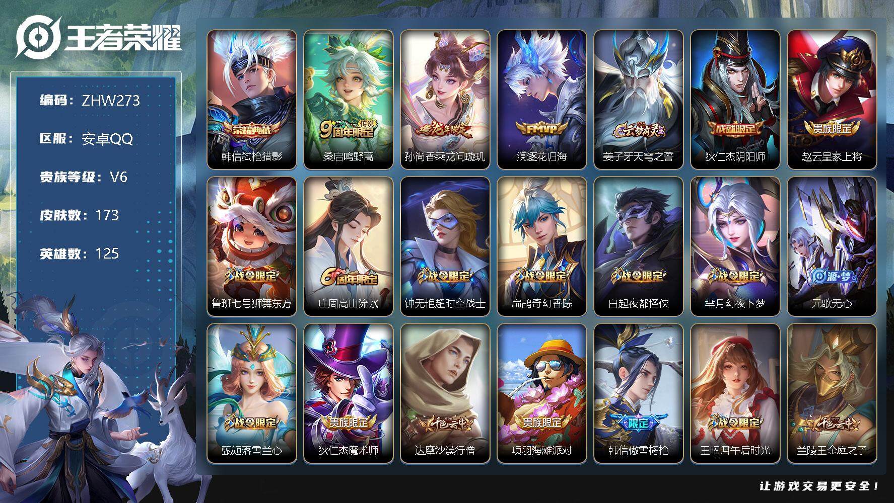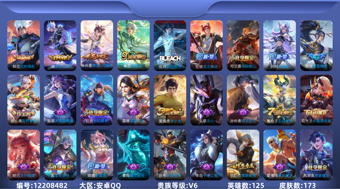 [12208482]【特价急出/详情看图】:安卓Q-V6-永恒钻石I段位-125英雄-173皮肤-1典藏-3传说-55史诗