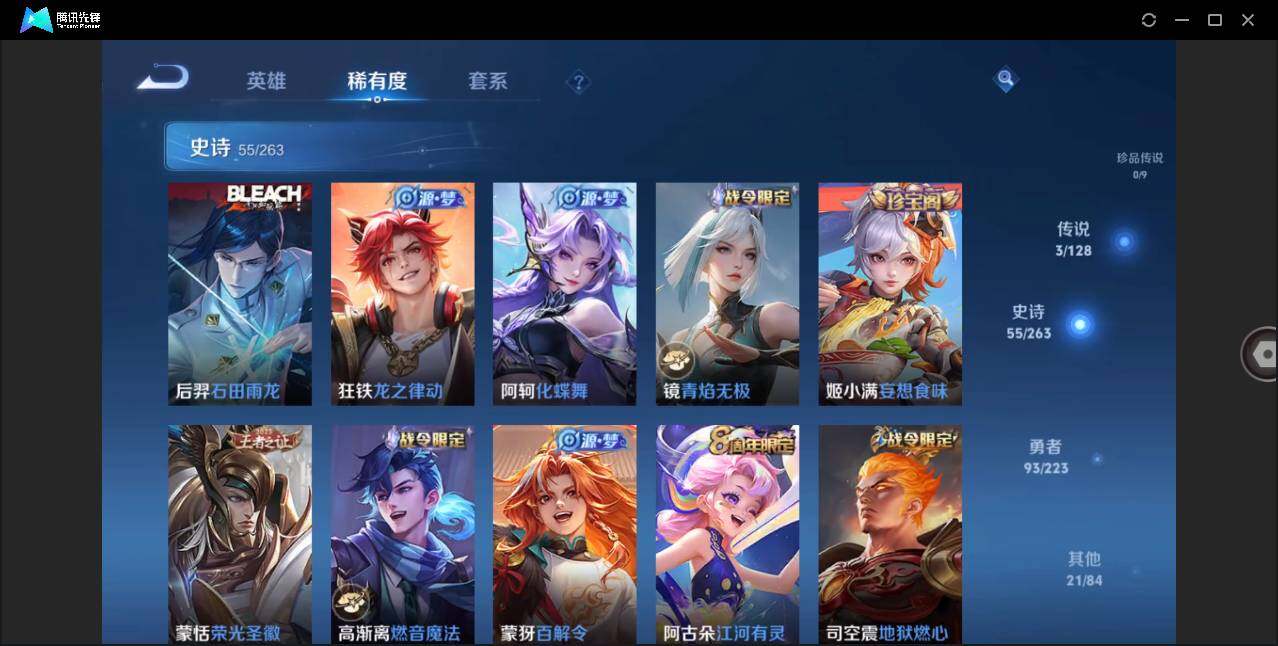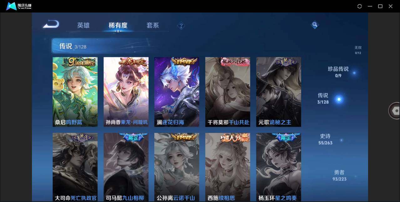 - PX_2104965-Q/至尊星耀/126皮肤/124英雄/1典藏/0珍品无双/0无双/1珍品传说/11传说/39史诗/8稀有英雄 【1 珍品传说】时之奇旅 孙策, 【1 典藏皮肤】弑枪猎影 韩信, 【11 传说皮肤】胖达荣荣 梦奇,碎云 百里守约,云鹰飞将 曜,齐天大圣 孙悟空,仲夏夜之梦 貂蝉,霜月吟 露娜,一念神魔 李信,愿照·九州拓 澜,愿照·山河定 司空震,祥瑞亨通 裴擒虎,鸣野蒿 桑启