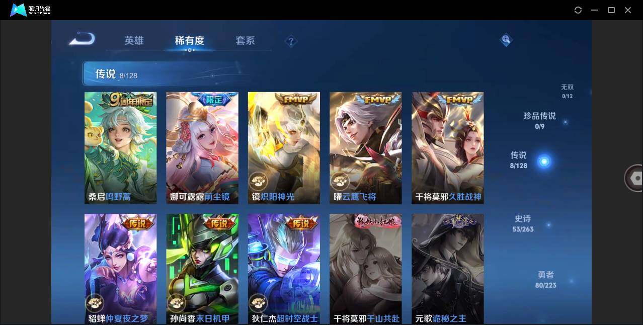【传说皮肤】:桑启鸣野蒿,娜可露露前尘镜,镜炽阳神光,曜云鹰飞将,干将莫邪久胜战神,貂蝉仲夏夜之梦,孙尚香末日机甲,狄仁杰超时空战士