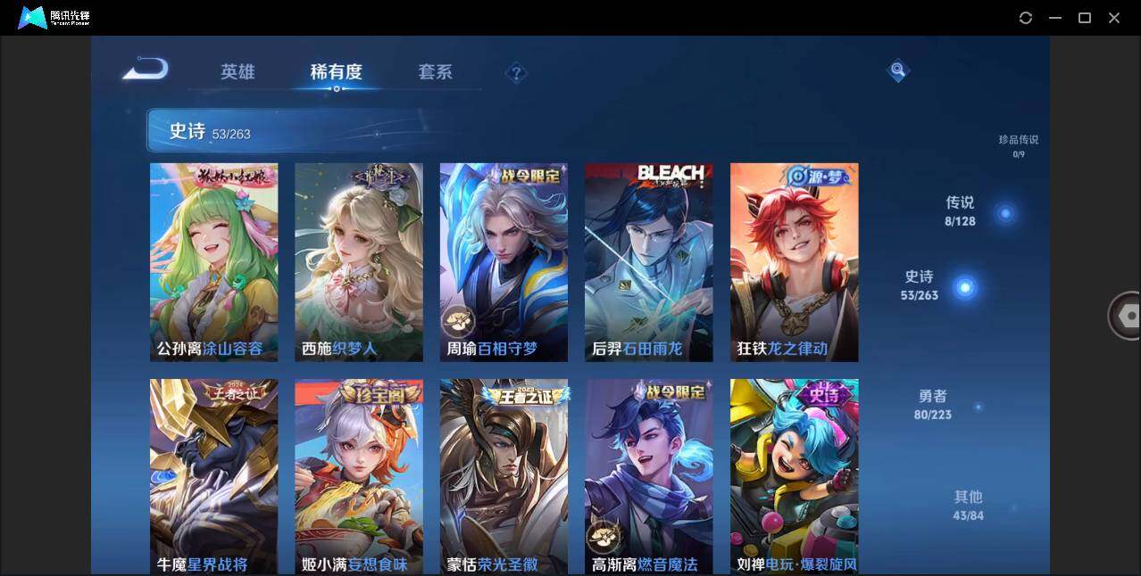 【史诗皮肤】:鲁班七号电玩小子,露娜紫霞仙子,赵云皇家上将,甄姬冰雪圆舞曲,狄仁杰魔术师,廉颇地狱岩魂,宫本武藏鬼剑武藏,嬴政优雅恋人,妲己魅力维加斯,墨子金属风暴,吕布圣诞狂欢,曹操幽灵船长,李白千年之狐,吕布末日机甲,张飞乱世虎臣,花木兰水晶猎龙者,刘邦德古拉伯爵,夏侯惇乘风破浪,小乔缤纷独角兽,诸葛亮黄金分割率,亚瑟心灵战警,后羿辉光之辰,铠曙光守护者,蔡文姬舞动绿茵,李元芳逐浪之夏,白起星夜王子,孙策猫狗日记,狄仁杰鹰眼统帅,上官婉儿梁祝,李元芳银河之约,不知火舞魅语,百里玄策原初追逐者,元歌云间偶戏,西施诗语江南,庄周高山流水,嫦娥拒霜思,雅典娜黎明之