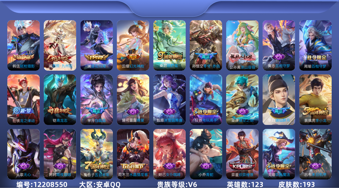 [12208550]【特价急出/详情看图】:安卓Q-V6-永恒钻石III段位-123英雄-193皮肤-1典藏-5传说-49史诗