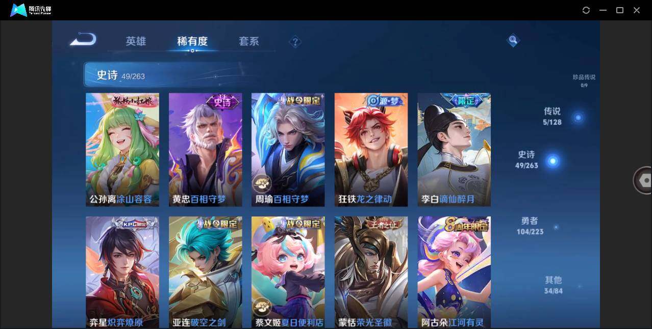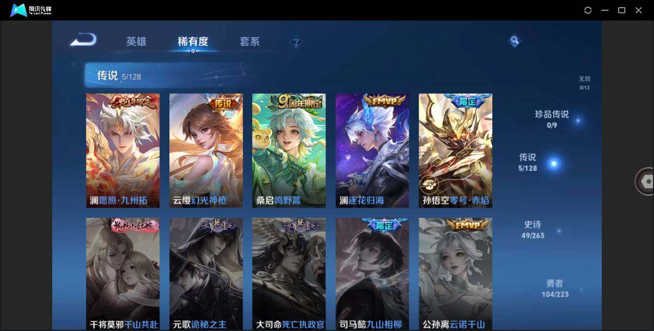 - PX_2109908-Q/至尊星耀/299皮肤/125英雄/1典藏/0珍品无双/0无双/0珍品传说/32传说/81史诗/9稀有英雄 【1 典藏皮肤】弑枪猎影 韩信, 【32 传说皮肤】枫霜尽 橘右京,启明星使 虞姬,云霓雀翎 虞姬,碎云 百里守约,逐花归海 澜,飞鸢探春 李元芳,地狱火 孙悟空,云鹰飞将 曜,补天 女娲,游龙清影 西施,灼幽烈阳 东皇太一,猫影幻舞 貂蝉,仲夏夜之梦 貂蝉,地狱之眼