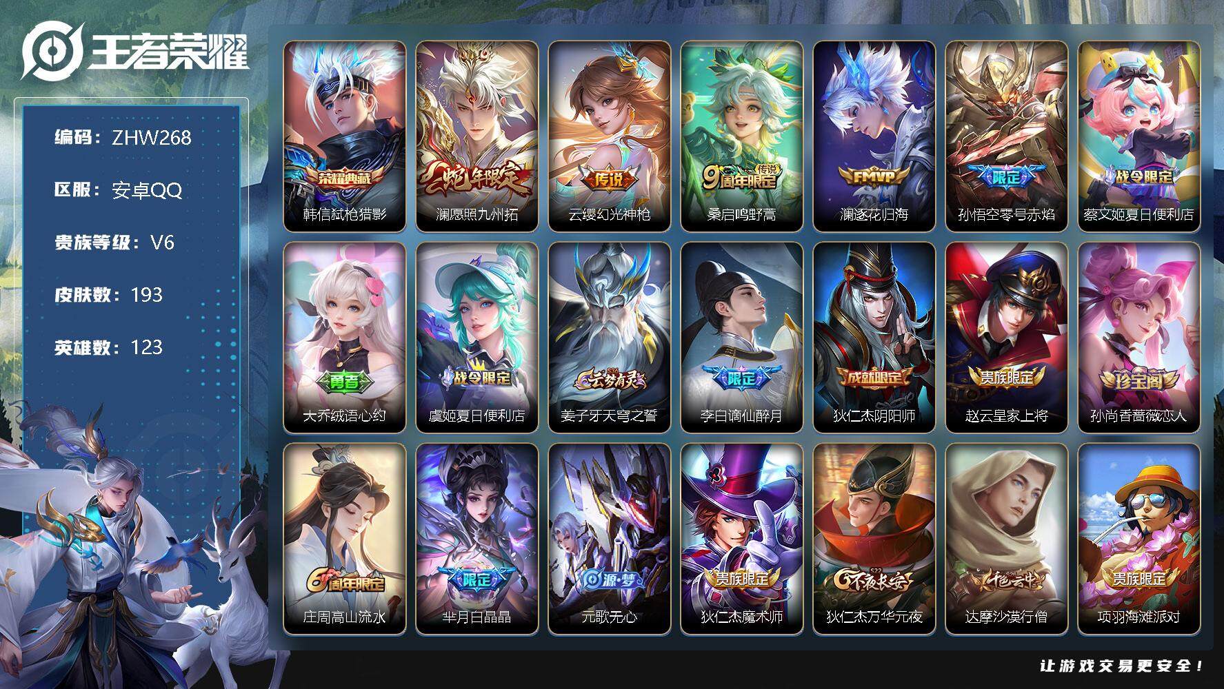 [12208550]【特价急出/详情看图】:安卓Q-V6-永恒钻石III段位-123英雄-193皮肤-1典藏-5传说-49史诗 【荣耀典藏】:韩信弑枪猎影 【传说皮肤】:澜愿照九州拓,云缨幻光神枪,桑启鸣野蒿,澜逐花归海,孙悟空零号赤焰 【限定皮肤】:蔡文姬夏日便利店,大乔绒语心约,虞姬夏日便利店,姜子牙天穹之誓,李白谪仙醉月,狄仁杰阴阳师,赵云皇家上将,孙尚香蔷薇恋人,庄周高山流水,芈月白晶晶,元歌无心,狄仁杰魔术师,狄仁杰万华元夜,达摩沙漠行僧,项羽海滩派对,程咬金演武夺筹,王昭君午后时光,兰陵王金庭之子,孙悟空零号赤焰,李元芳云中旅人,钟馗驱傩正仪,杨玉环遇见飞天,干将莫邪胡桃夹子,雅典娜黎明之约,蔡文姬繁星吟游,鬼谷子原初探秘者,鬼谷子五谷丰年,铠青龙志,苏烈千军破阵,梦奇顽趣,沈梦溪大漠名商,裴擒虎李小龙,裴擒虎擒涛扼浪,狂铁电玩高手,鲁班大师探海日志,桑启海盐诗旅,戈娅驭风魔法,阿古朵江河有灵,张良古海寻踪,蒙恬荣光圣徽,鬼谷子天穹祈灯,沈梦溪龙舞盛年,刘邦剑破天穹,程咬金群星魔术团,周瑜熔金海岸 【年限皮肤】:铠青龙志 【赛季限定】:狄仁杰万华元夜,达摩沙漠行僧,程咬金演武夺筹,兰陵王金庭之子,张良古海寻踪,李元芳云中旅人,钟馗驱傩正仪,雅典娜黎明之约,鬼谷子原初探秘者,苏烈千军破阵,梦奇顽趣,沈梦溪大漠名商,裴擒虎擒涛扼浪,鲁班大师探海日志,桑启海盐诗旅,鬼谷子天穹祈灯,蒙恬荣光圣徽,刘邦剑破天穹,姜子牙天穹之誓 【战令限定】:蔡文姬夏日便利店,虞姬夏日便利店,王昭君午后时光,狂铁电玩高手,戈娅驭风魔法 【史诗皮肤】:阿轲暗夜猫娘,赵云皇家上将,貂蝉圣诞恋歌,甄姬冰雪圆舞曲,狄仁杰魔术师,宫本武藏鬼剑武藏,孙尚香蔷薇恋人,孙尚香水果甜心,妲己魅力维加斯,妲己女仆咖啡,墨子金属风暴,吕布圣诞狂欢,李白千年之狐,吕布末日机甲,张飞乱世虎臣,韩信白龙吟,花木兰水晶猎龙者,夏侯惇乘风破浪,诸葛亮黄金分割率,安琪拉心灵骇客,百里守约特工魅影,刘禅天才门将,李元芳逐浪之夏,杨玉环遇见飞天,铠青龙志,狄仁杰鹰眼统帅,蔡文姬繁星吟游,娜可露露晚萤,小乔青蛇,裴擒虎李小龙,芈月白晶晶,庄周高山流水,雅典娜黎明之约,貂蝉唤灵魅影,狂铁电玩高手,鬼谷子五谷丰年,元歌无心,梦奇顽趣,戈娅驭风魔法,阿古朵江河有灵,蒙恬荣光圣徽,蔡文姬夏日便利店,亚连破空之剑,弈星炽弈燎原,李白谪仙醉月,狂铁龙