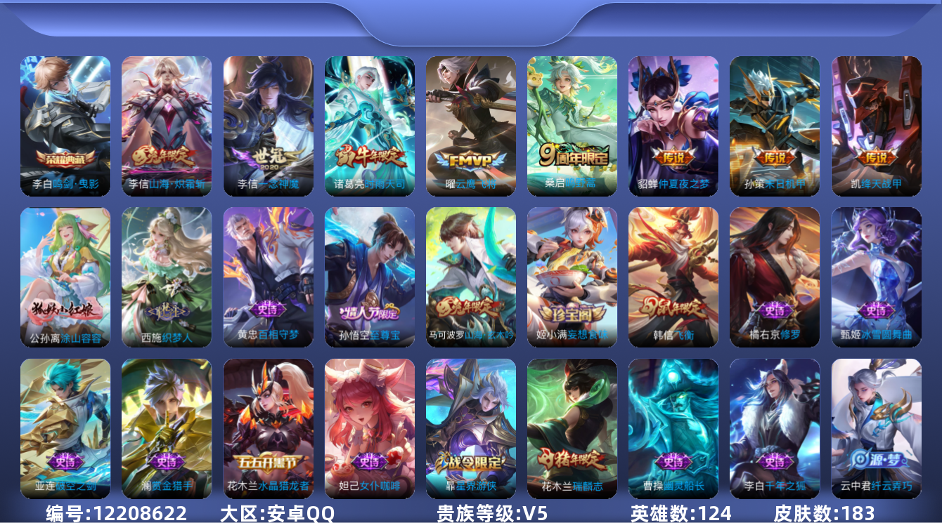 [12208622]【特价急出/详情看图】:安卓Q-V5-尊贵铂金IV段位-124英雄-183皮肤-1典藏-8传说-41史诗