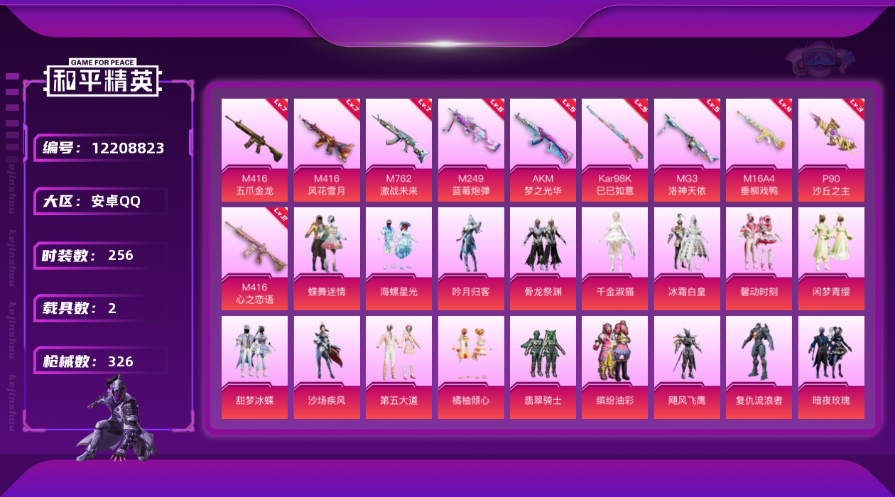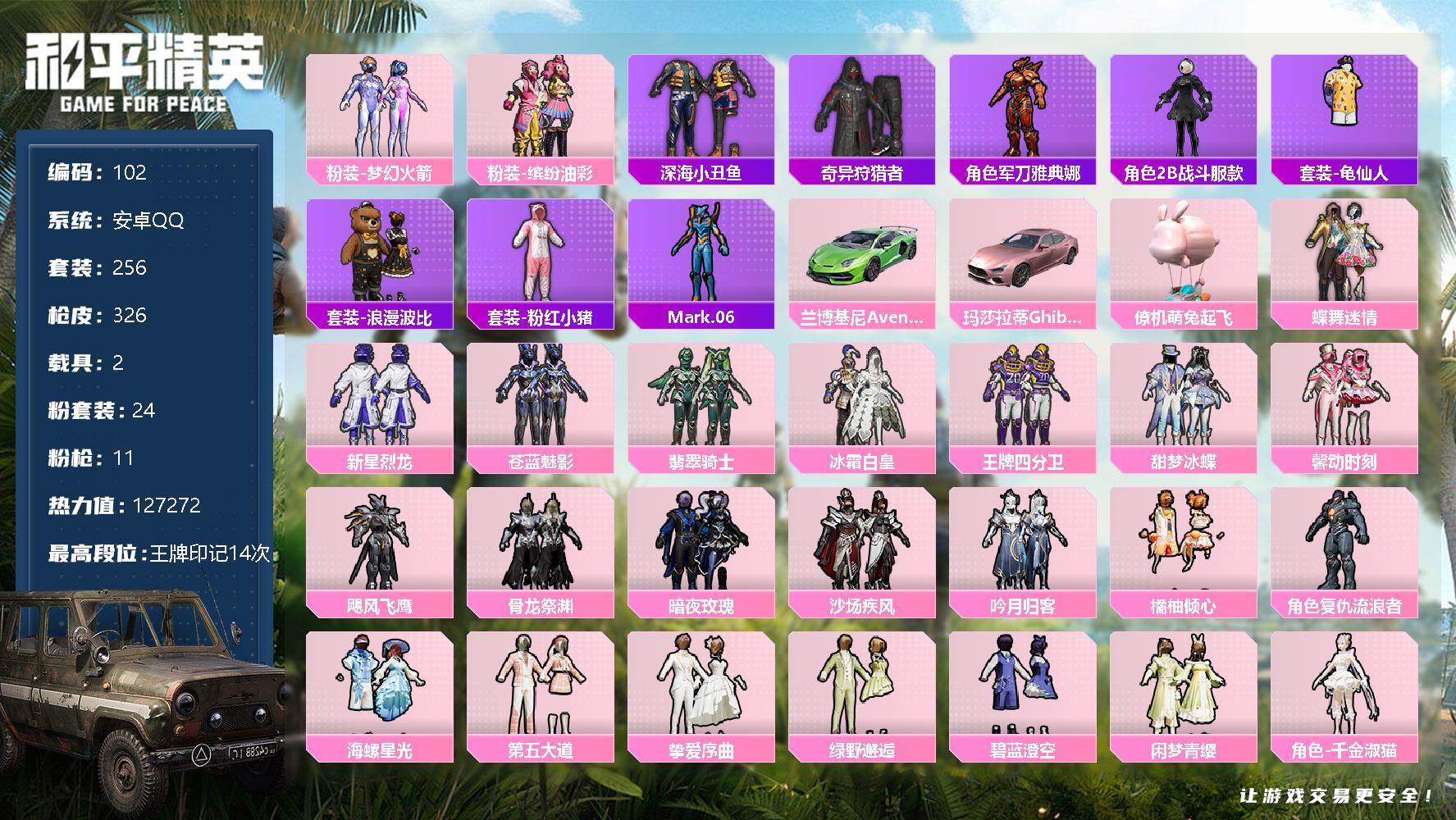 - [12409449]【特价急出/详情看图】:安卓 手Q-1粉装-2特效枪-2.5w热力值-6王牌印记-74套装-92枪皮【热门品类】:角色-军刀雅典娜,套装-龟仙人,套装-粉红小猪【粉色套装】:粉装-未来歌姬【粉色枪皮等级】:M762-青锋波束(五级),Kar98K-巳巳如意(五级)