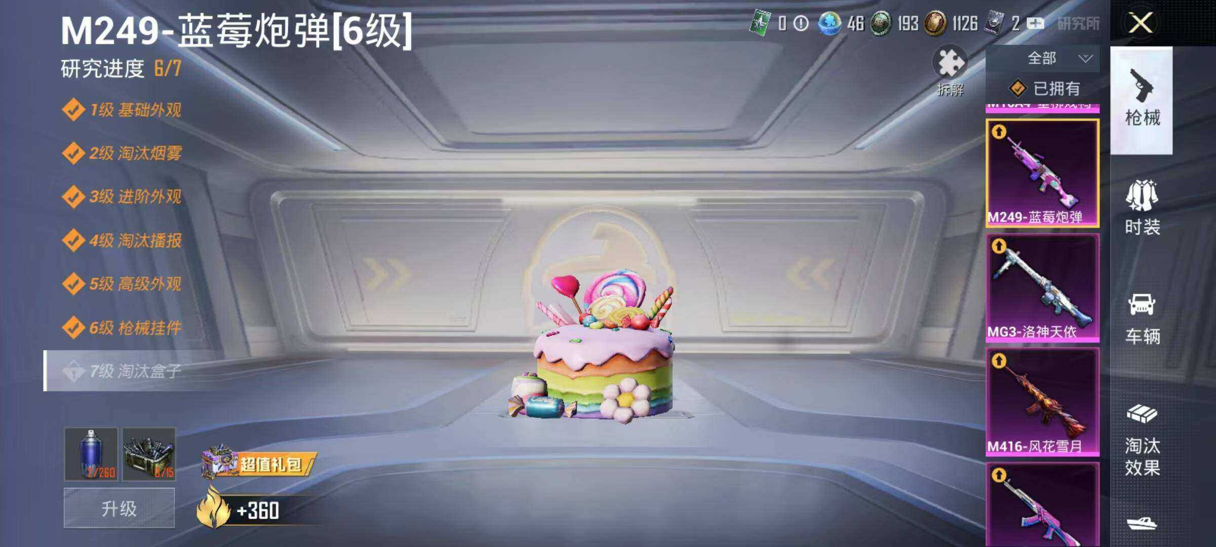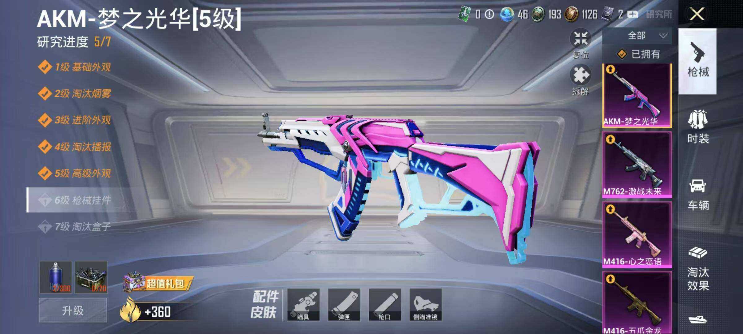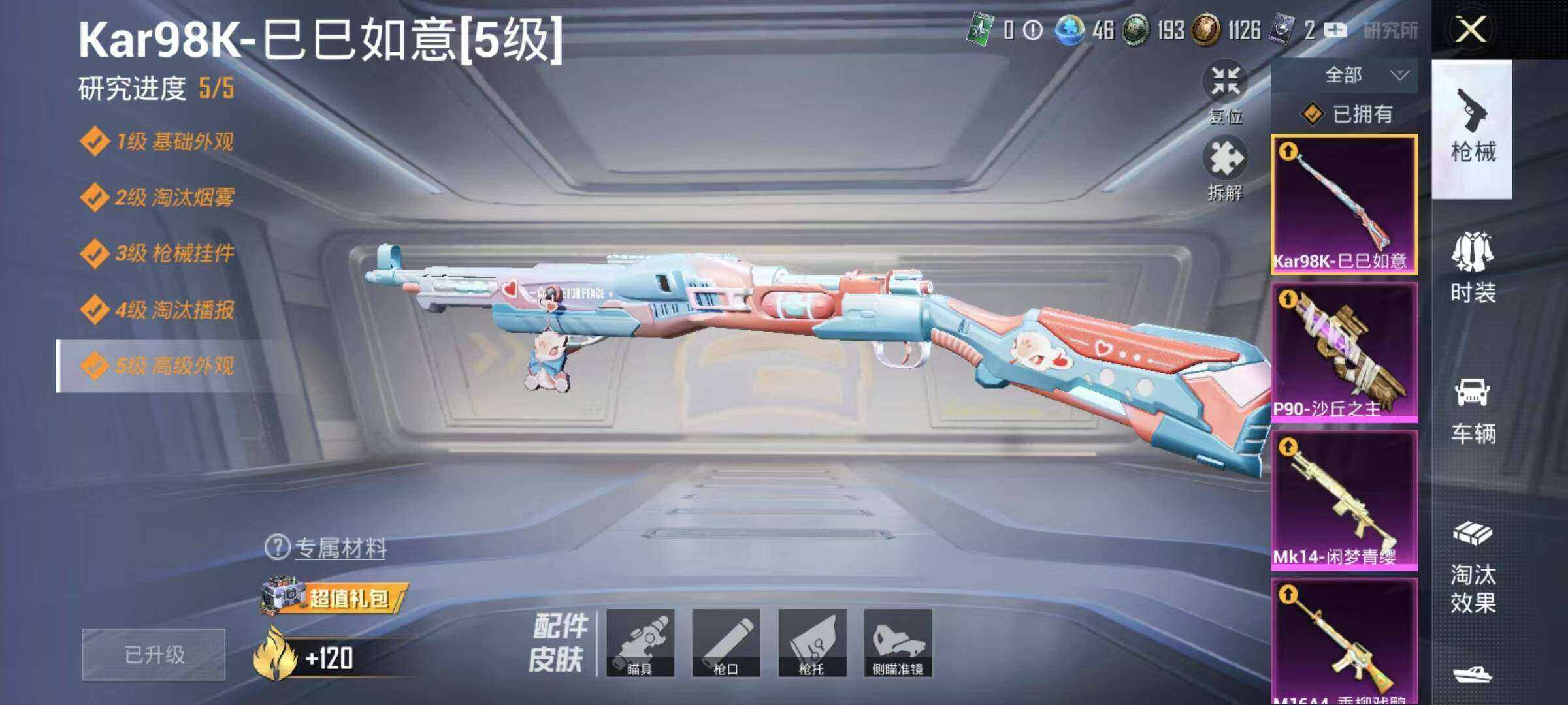 【粉色枪皮等级】:AKM-梦之光华(五级),M16A4-垂柳戏鸭(四级),M416-五爪金龙(七级),M416-心之恋语(二级),M416-风花雪月(七级),M762-激战未来(七级),P90-沙丘之主(三级),Kar98K-巳巳如意(五级),M249-蓝莓炮弹(六级),MG3-洛神天依(五级)