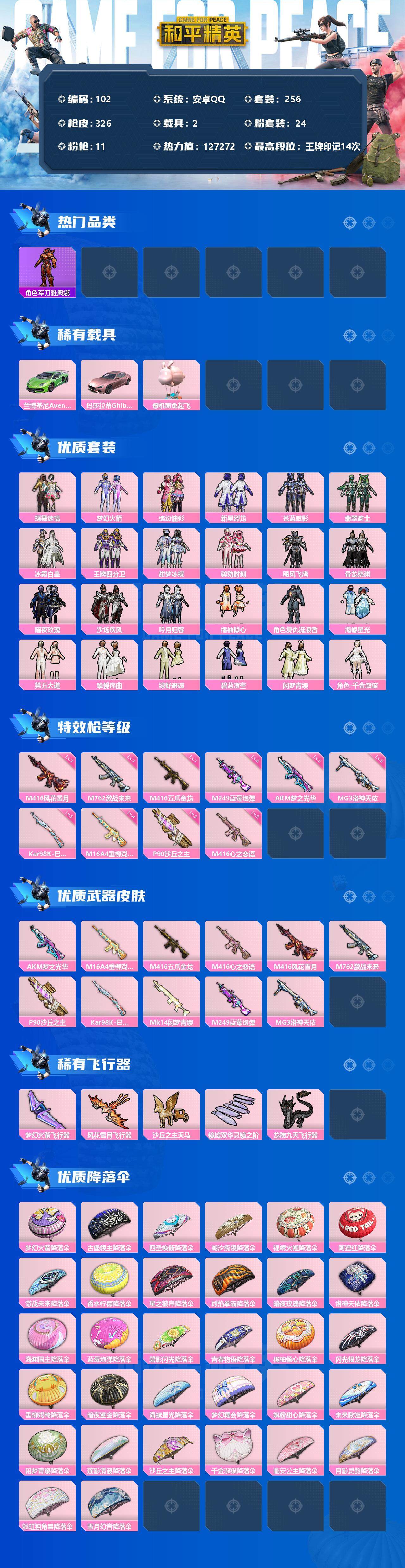 [12208823]【商品标题】:安卓-和平+王者双游戏!V8-397皮肤2典藏1珍品21传说 安卓 手Q-24粉装-11特效枪-2载具-5粉色飞行器-127272热力值-14王牌印记-256套装-326枪皮 【热门品类】:粉装-梦幻火箭,粉装-缤纷油彩,套装-深海小丑鱼,套装-奇异狩猎者,角色-军刀雅典娜,角色-2B战斗服款,套装-龟仙人,套装-浪漫波比,套装-粉红小猪,角色-Mark.06 【粉色载具】:兰博基尼Aventador SVJ(翡翠绿),玛莎拉蒂Ghibli(粉),僚机-萌兔起飞 【粉色套装】:粉装-蝶舞迷情,粉装-梦幻火箭,粉装-缤纷油彩,粉装-新星烈龙,粉装-苍蓝魅影,粉装-翡翠骑士,粉装-冰霜白皇,粉装-王牌四分卫,粉装-甜梦冰蝶,粉装-馨动时刻,粉装-飓风飞鹰,粉装-骨龙祭渊,粉装-暗夜玫瑰,粉装-沙场疾风,粉装-吟月归客,粉装-橘柚倾心,角色-复仇流浪者,粉装-海螺星光,粉装-第五大道,粉装-挚爱序曲,粉装-绿野邂逅,粉装-碧蓝澄空,粉装-闲梦青缨,角色-千金淑猫 【粉色枪皮等级】:AKM-梦之光华(五级),M16A4-垂柳戏鸭(四级),M416-五爪金龙(七级),M416-心之恋语(二级),M416-风花雪月(七级),M762-激战未来(七级),P90-沙丘之主(三级),Kar98K-巳巳如意(五级),M249-蓝莓炮弹(六级),MG3-洛神天依(五级) 【粉色枪皮】:AKM-梦之光华,M16A4-垂柳戏鸭,M416-五爪金龙,M416-心之恋语,M416-风花雪月,M762-激战未来,P90-沙丘之主,Kar98K-巳巳如意,Mk14-闲梦青缨,M249-蓝莓炮弹,MG3-洛神天依 【粉色飞行器】:梦幻火箭飞行器,风花雪月飞行器,沙丘之主天马,镜域双华-灵镜之阶,龙翔九天飞行器 【粉色降落伞】:梦幻火箭降落伞,古堡领主降落伞,四圣焕新降落伞,潮汐统领降落伞,锦绣火鲤降落伞,阿狸红降落伞,激战未来降落伞,香水柠檬降落伞,星之彼岸降落伞,烈焰拳霸降落伞,暗夜玫瑰降落伞,洛神天依降落伞,海渊国主降落伞,蓝莓炮弹降落伞,碧影闪光降落伞,青春物语降落伞,橘柚倾心降落伞,闪光银龙降落伞,垂柳戏鸭降落伞,暗夜鎏金降落伞,海螺星光降落伞,梦幻舞会降落伞,飒粉甜心降落伞,未来歌姬降落伞,闲梦青缨降落伞,莲影清波降落伞,沙丘之主降落伞,千金淑猫降落伞,临安公主降落伞,月影