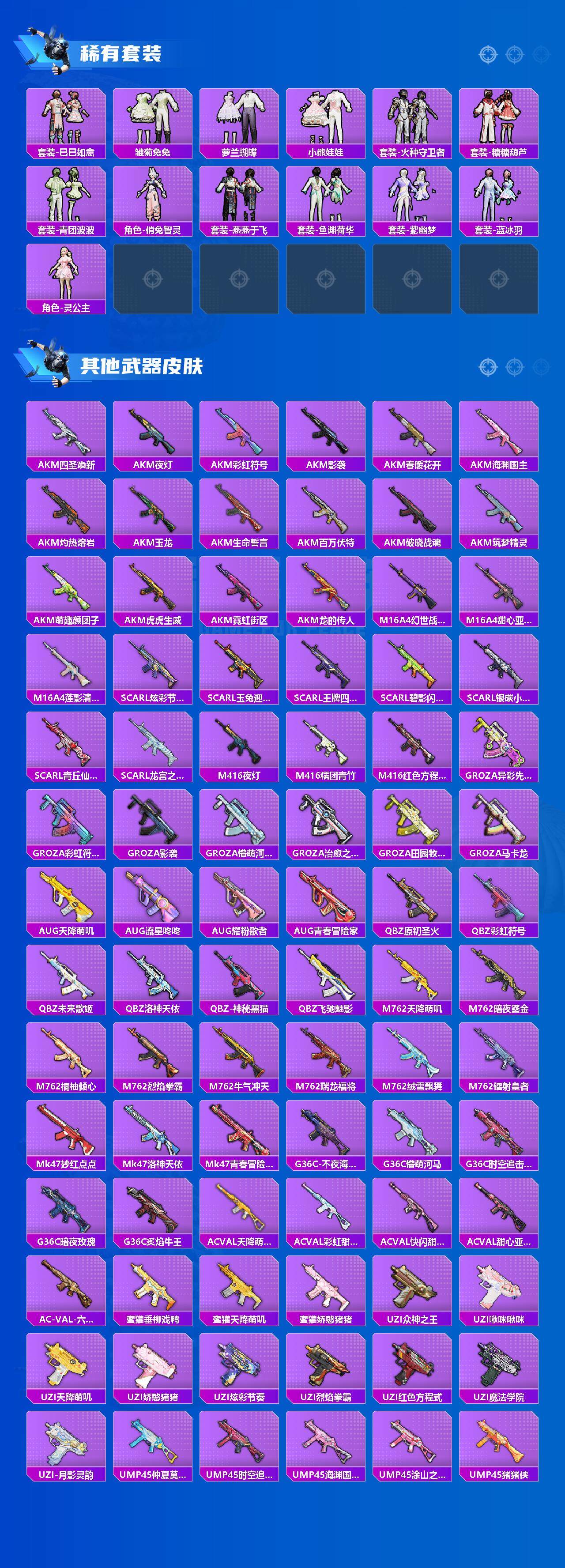 AKM-梦之光华,M16A4-垂柳戏鸭,M416-五爪金龙,M416-心之恋语,M416-风花雪月,M762-激战未来,P90-沙丘之主,Kar98K-巳巳如意,Mk14-闲梦青缨,M249-蓝莓炮弹,MG3-洛神天依