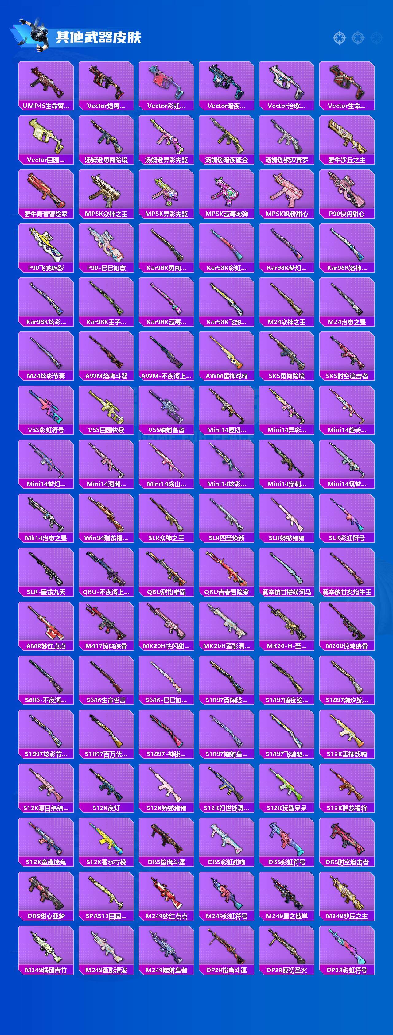 【粉色枪皮】:AKM-梦之光华,M16A4-垂柳戏鸭,M416-五爪金龙,M416-心之恋语,M416-风花雪月,M762-激战未来,P90-沙丘之主,Kar98K-巳巳如意,Mk14-闲梦青缨,M249-蓝莓炮弹,MG3-洛神天依