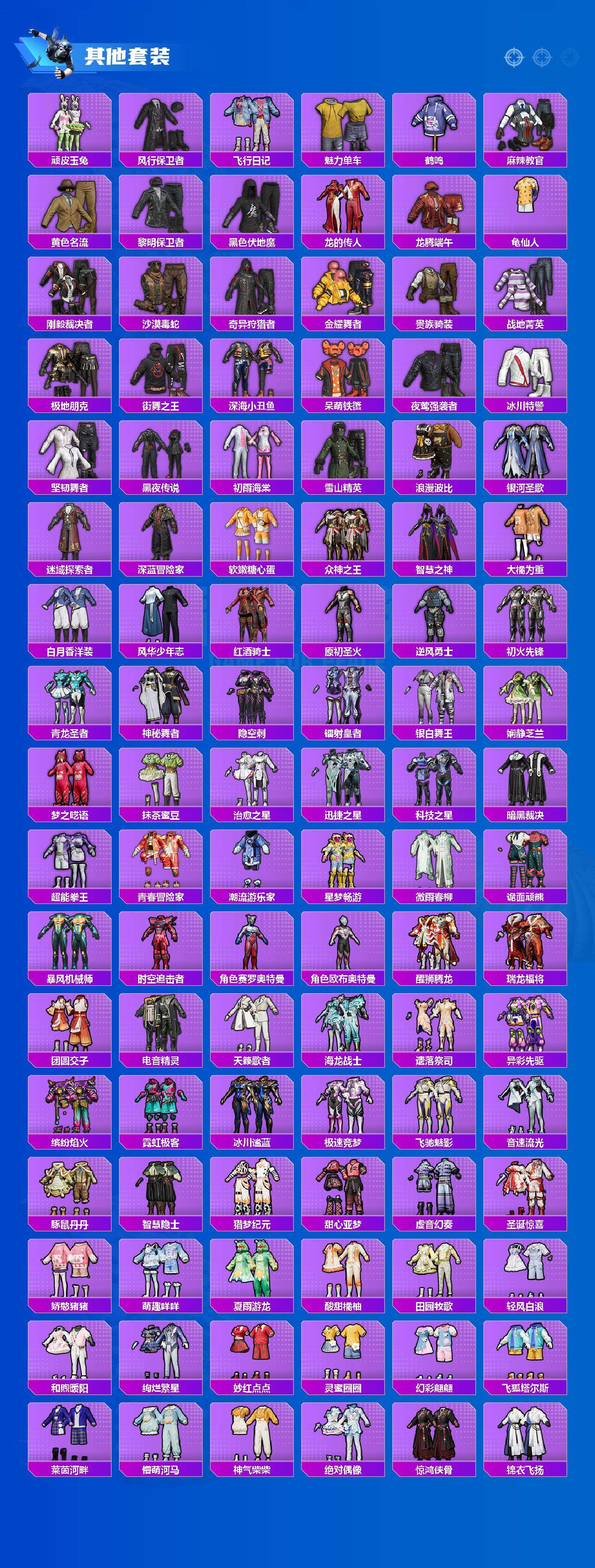套装-蝶舞迷情,套装-海螺星光,套装-吟月归客,套装-绿野邂逅,套装-骨龙祭渊,角色-千金淑猫,套装-馨动时刻,套装-碧蓝澄空,套装-闲梦青缨,套装-甜梦冰蝶,套装-沙场疾风,套装-第五大道,套装-橘柚倾心,套装-翡翠骑士,套装-缤纷油彩,套装-飓风飞鹰,角色-复仇流浪者,套装-暗夜玫瑰,套装-新星烈龙,套装-挚爱序曲,套装-苍蓝魅影,套装-王牌四分卫