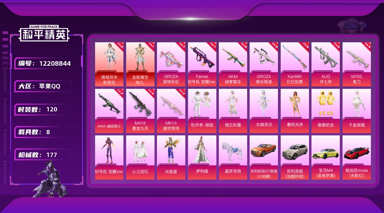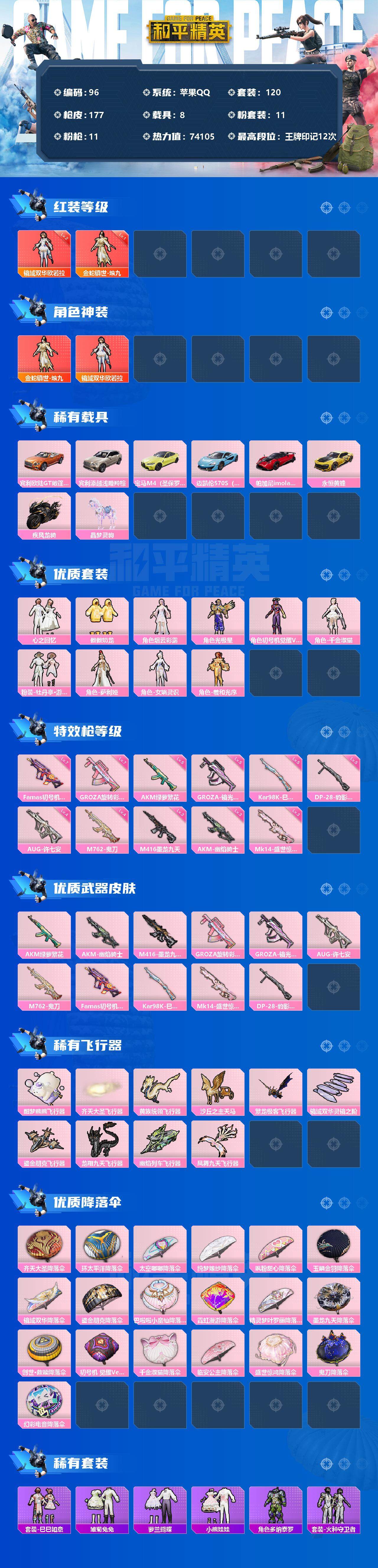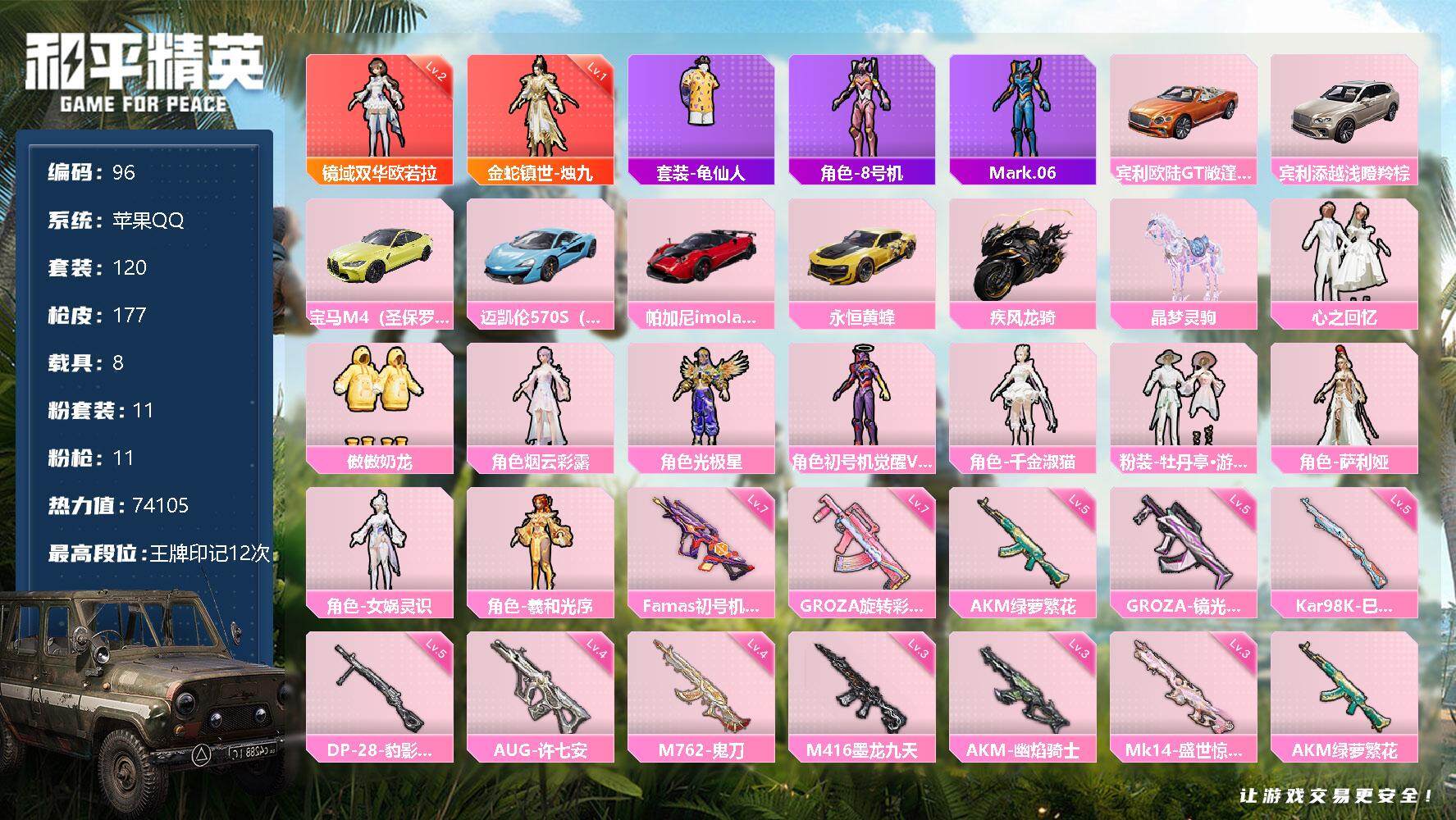 [12208844]【商品标题】:金蛇镇世-烛九(一级)!苹果 手Q-2神装-11粉装-11特效枪-8载具-12粉色飞行器-74105热力值-12王牌印记-120套装-177枪皮