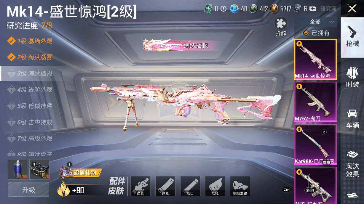【粉色枪皮等级】:AKM-绿萝繁花(五级),AKM-幽焰骑士(三级),M416-墨龙九天(三级),GROZA-旋转彩虹(七级),GROZA-镜光银凌(五级),AUG-许七安(四级),M762-鬼刀(四级),Famas-初号机 觉醒Ver.(七级),Kar98K-巳巳如意(五级),Mk14-盛世惊鸿(三级),DP-28-豹影疾电(五级)