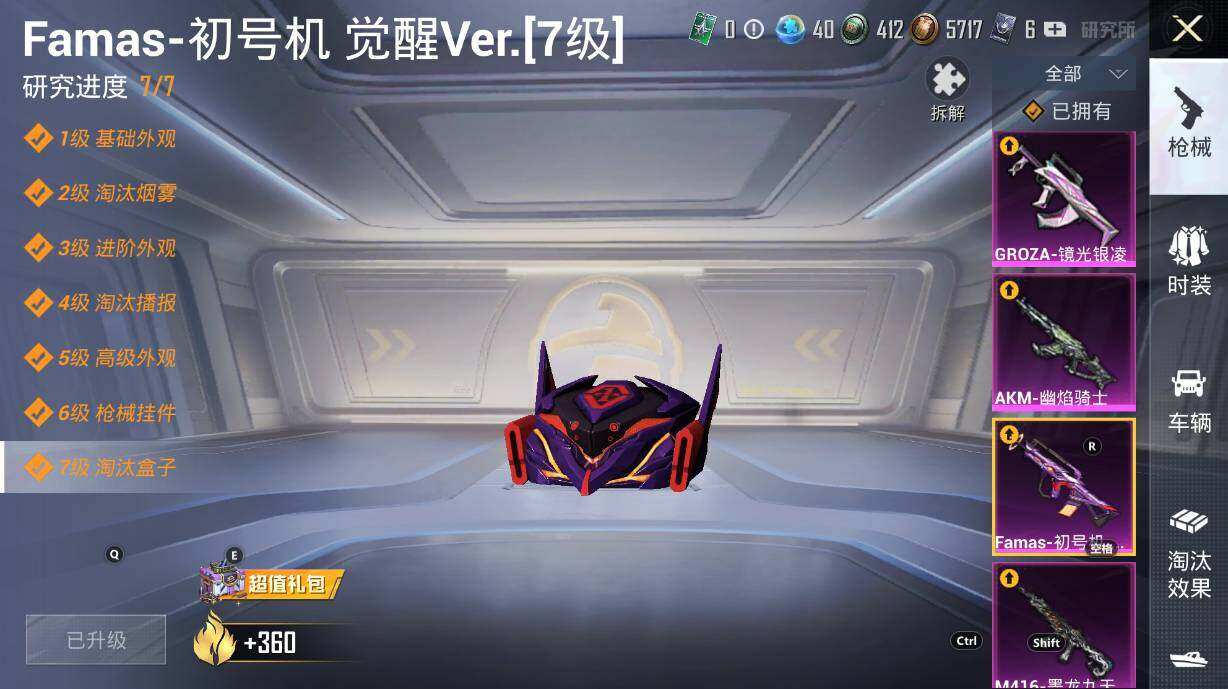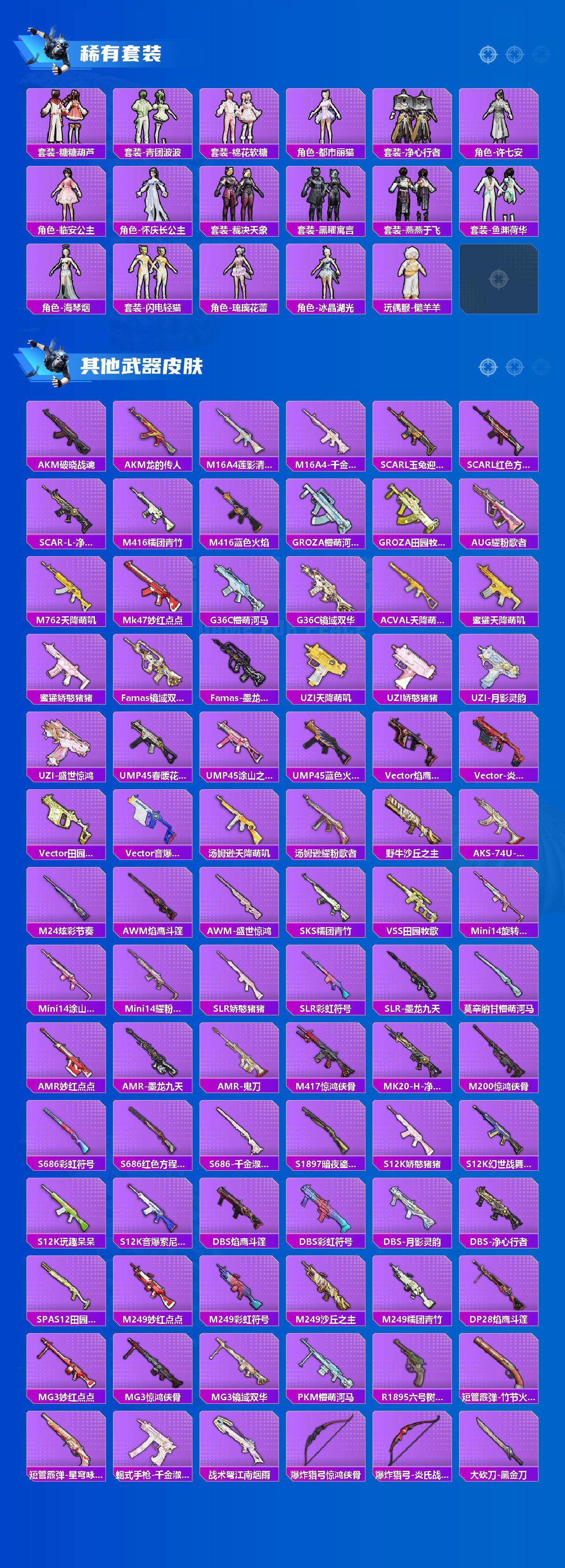 AKM-绿萝繁花,AKM-幽焰骑士,M416-墨龙九天,GROZA-旋转彩虹,GROZA-镜光银凌,AUG-许七安,M762-鬼刀,Famas-觉醒初号机,Kar98K-巳巳如意,Mk14-盛世惊鸿