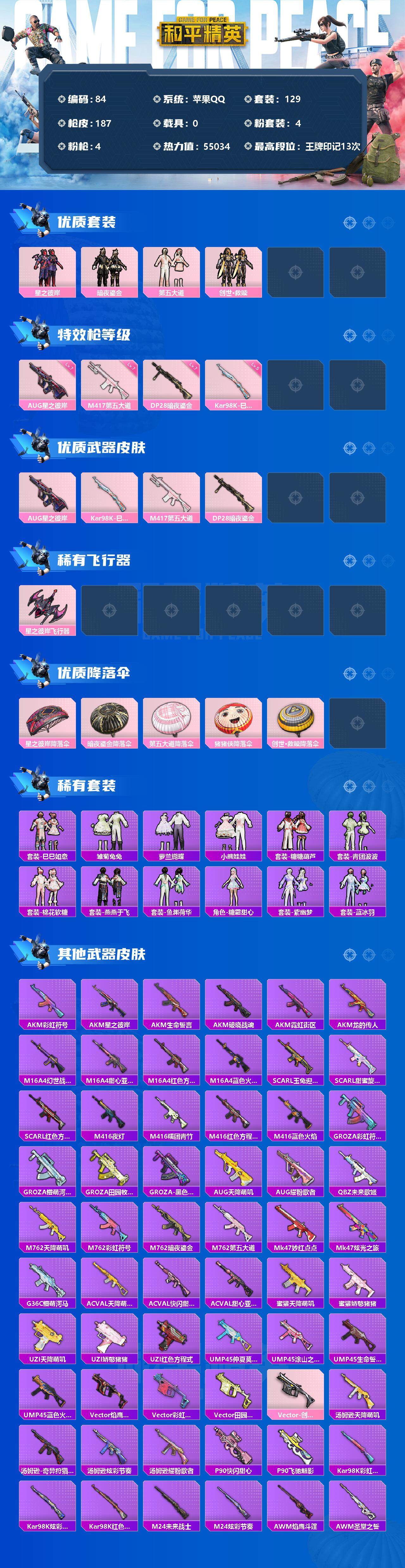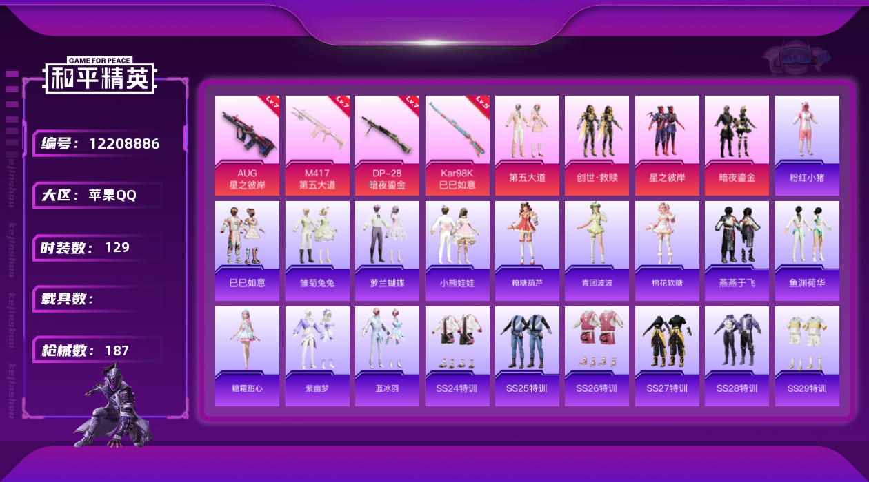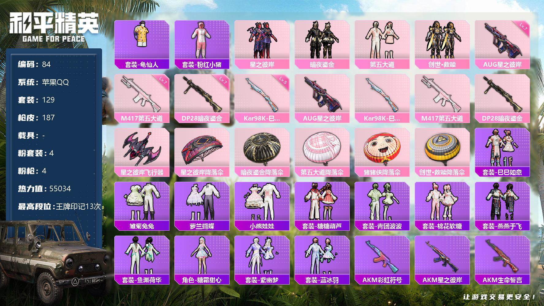 [12208886]【商品标题】:苹果 手Q-4粉装-4特效枪-0载具-1粉色飞行器-55034热力值-13王牌印记-129套装-187枪皮
