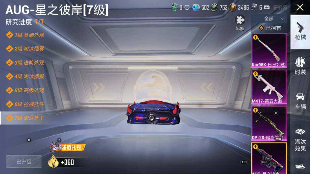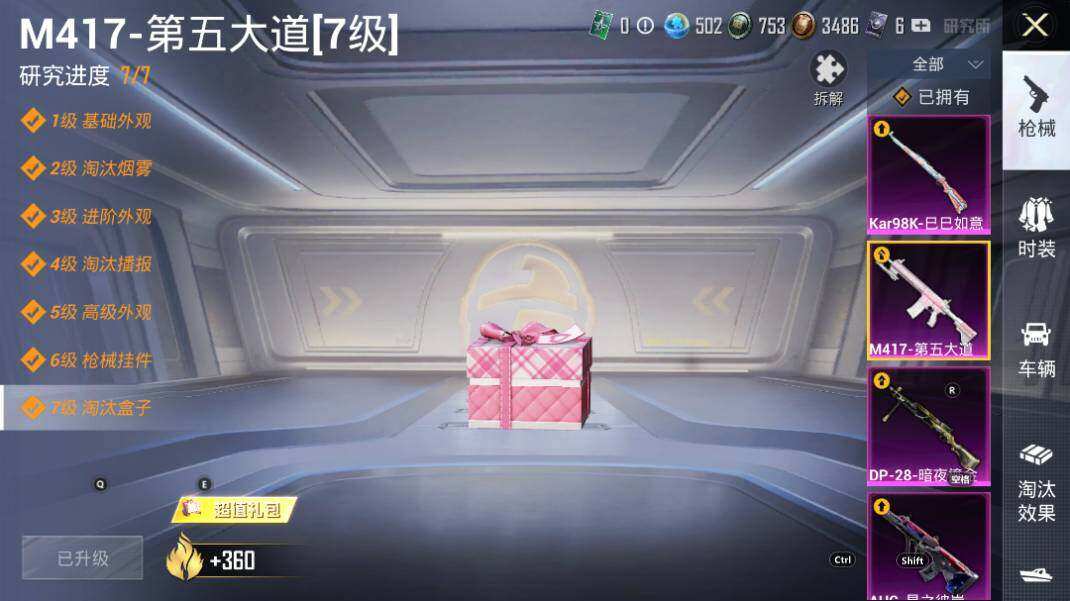 【粉色枪皮等级】:AUG-星之彼岸(七级),Kar98K-巳巳如意(五级),M417-第五大道(七级),DP-28-暗夜鎏金(七级)
