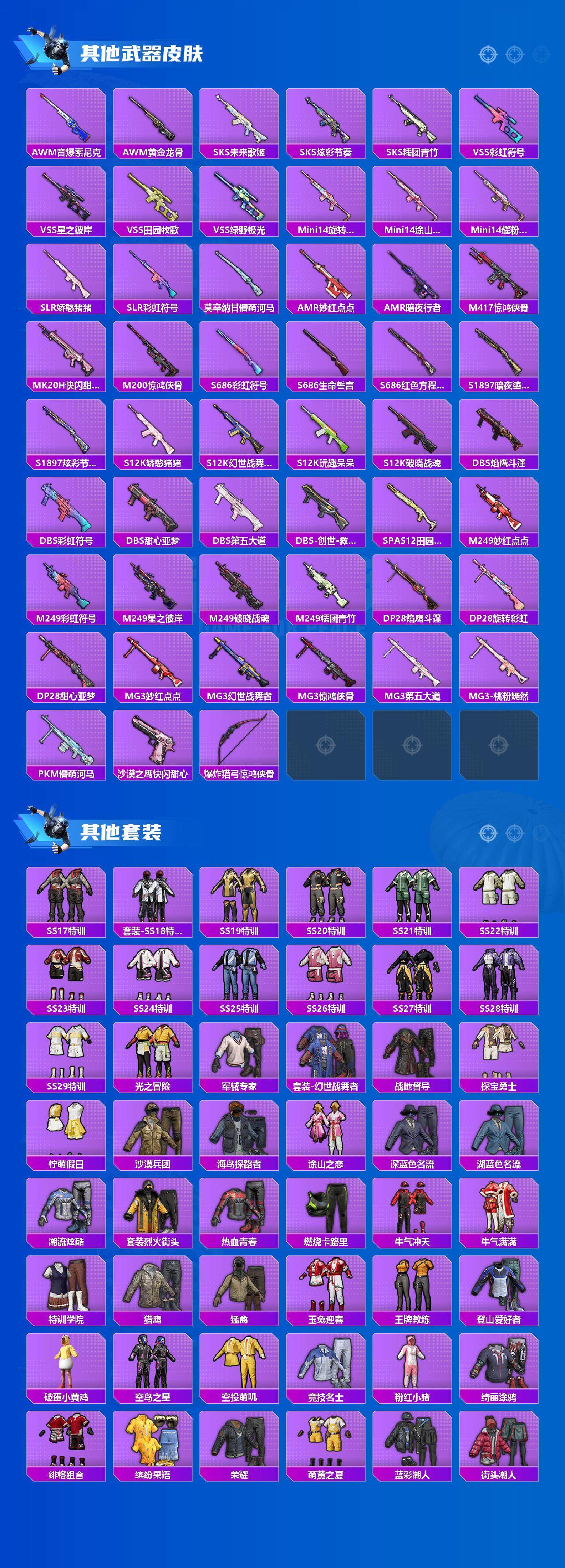 【稀有枪皮】:AKM-彩虹符号,AKM-星之彼岸,AKM-生命誓言,AKM-破晓战魂,AKM-霓虹街区,AKM-龙的传人,M16A4-幻世战舞者,M16A4-甜心亚梦,M16A4-红色方程式,M16A4-蓝色火焰,SCAR-L-玉兔迎春,SCAR-L-甜蜜旋律,SCAR-L-红色方程式,M416-夜灯,M416-糯团青竹,M416-红色方程式,M416-蓝色火焰,GROZA-彩虹符号,GROZA-懵萌河马,GROZA-田园牧歌,GROZA-黑色刀锋,AUG-天降萌叽,AUG-耀粉歌者,QBZ-未来歌姬,M762-天降萌叽,M762-彩虹符号,M762-暗夜鎏金,M762-第五大道,Mk47-妙红点点,Mk47-炫光之旅,G36C-懵萌河马,AC-VAL-天降萌叽,AC-VAL-快闪甜心,AC-VAL-甜心亚梦,蜜獾-天降萌叽,蜜獾-娇憨猪猪,UZI-天降萌叽,UZI-娇憨猪猪,UZI-红色方程式,UMP45-仲夏莫吉托,UMP45-涂山之恋,UMP45-生命誓言,UMP45-蓝色火焰,Vector-焰鹰斗篷,Vector-彩虹符号,Vector-田园牧歌,Vector-创世·救赎,汤姆逊-天降萌叽,汤姆逊-奇异狩猎者,汤姆逊-炫彩节奏,汤姆逊-耀粉歌者,P90-快闪甜心,P90-飞驰魅影,Kar98K-彩虹符号,Kar98K-炫彩节奏,Kar98K-红色方程