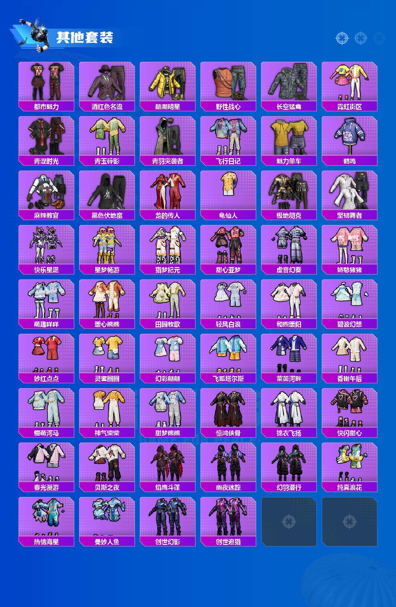 【稀有套装】:套装-龟仙人,套装-巳巳如意,套装-雏菊兔兔,套装-萝兰蝴蝶,套装-小熊娃娃,套装-糖糖葫芦,套装-青团波波,套装-棉花软糖,套装-燕燕于飞,套装-鱼渊荷华,角色-糖霜甜心,套装-紫幽梦,套装-蓝冰羽