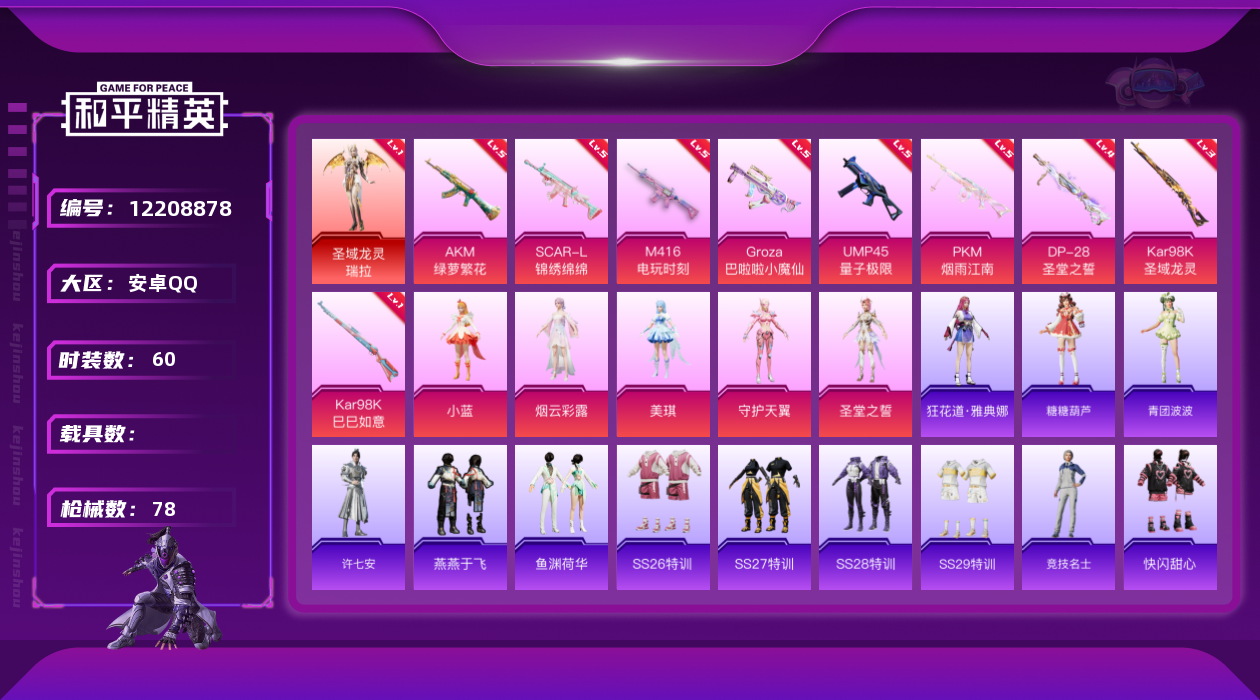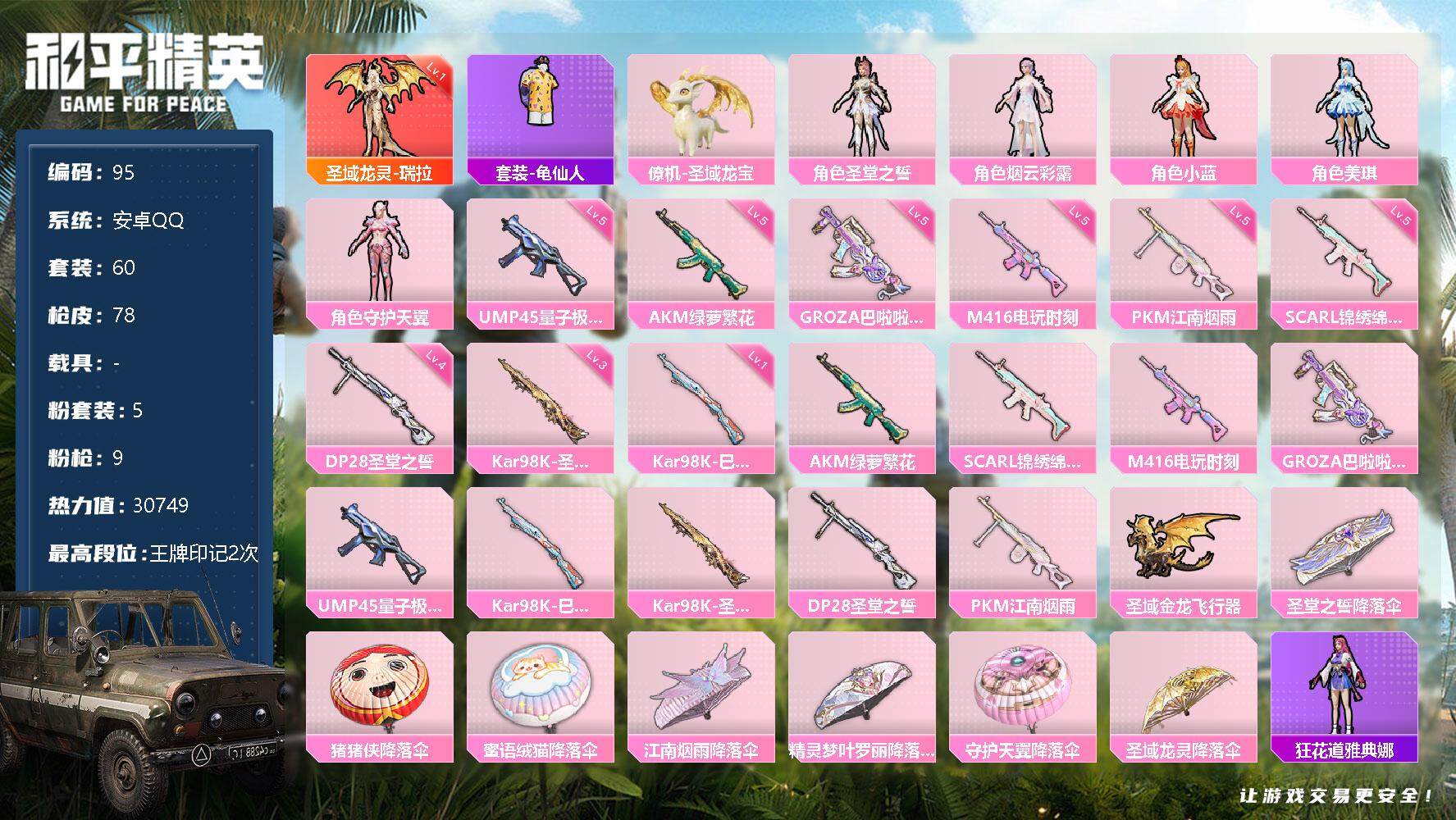 [12208878]【商品标题】:安卓 手Q-1神装-5粉装-9特效枪-0载具-1粉色飞行器-30749热力值-2王牌印记-60套装-78枪皮