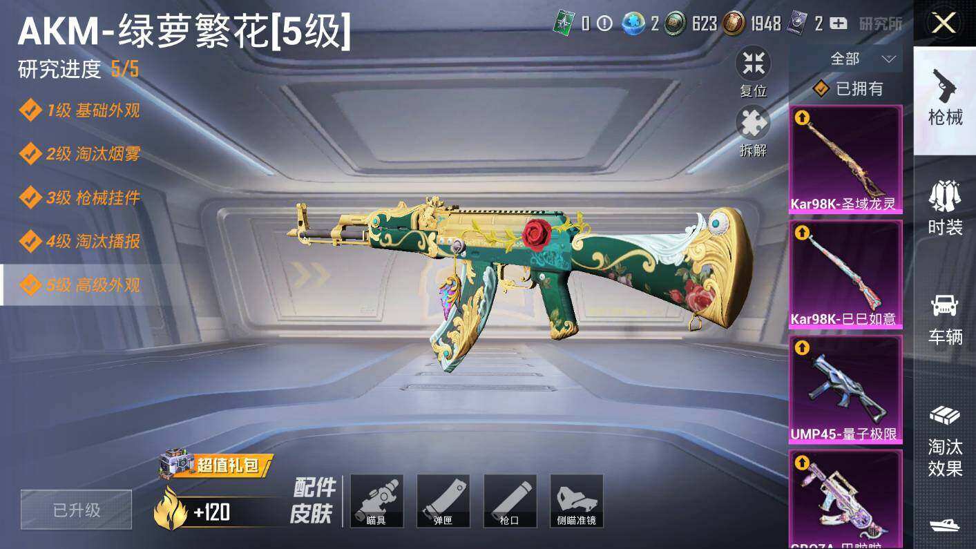 AKM-绿萝繁花,M416-电玩时刻,GROZA-巴啦啦小魔仙,UMP45-量子极限,Kar98K-巳巳如意,Kar98K-圣域龙灵,DP-28-圣堂之誓,PKM-江南烟雨