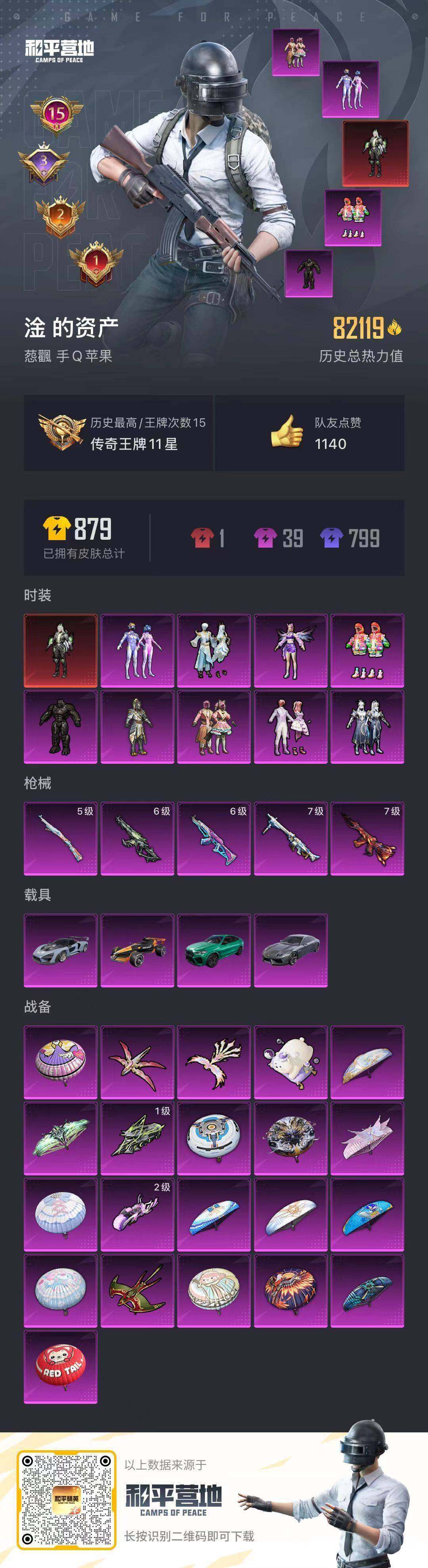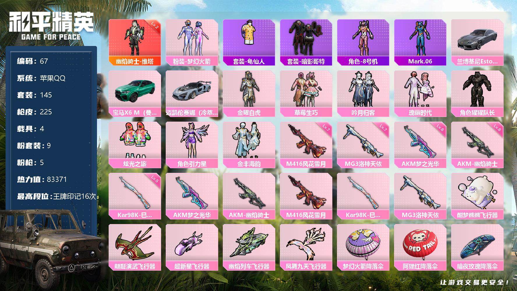 [12208860]【商品标题】:苹果 手Q-1神装-9粉装-5特效枪-4载具-6粉色飞行器-83371热力值-16王牌印记-145套装-225枪皮
