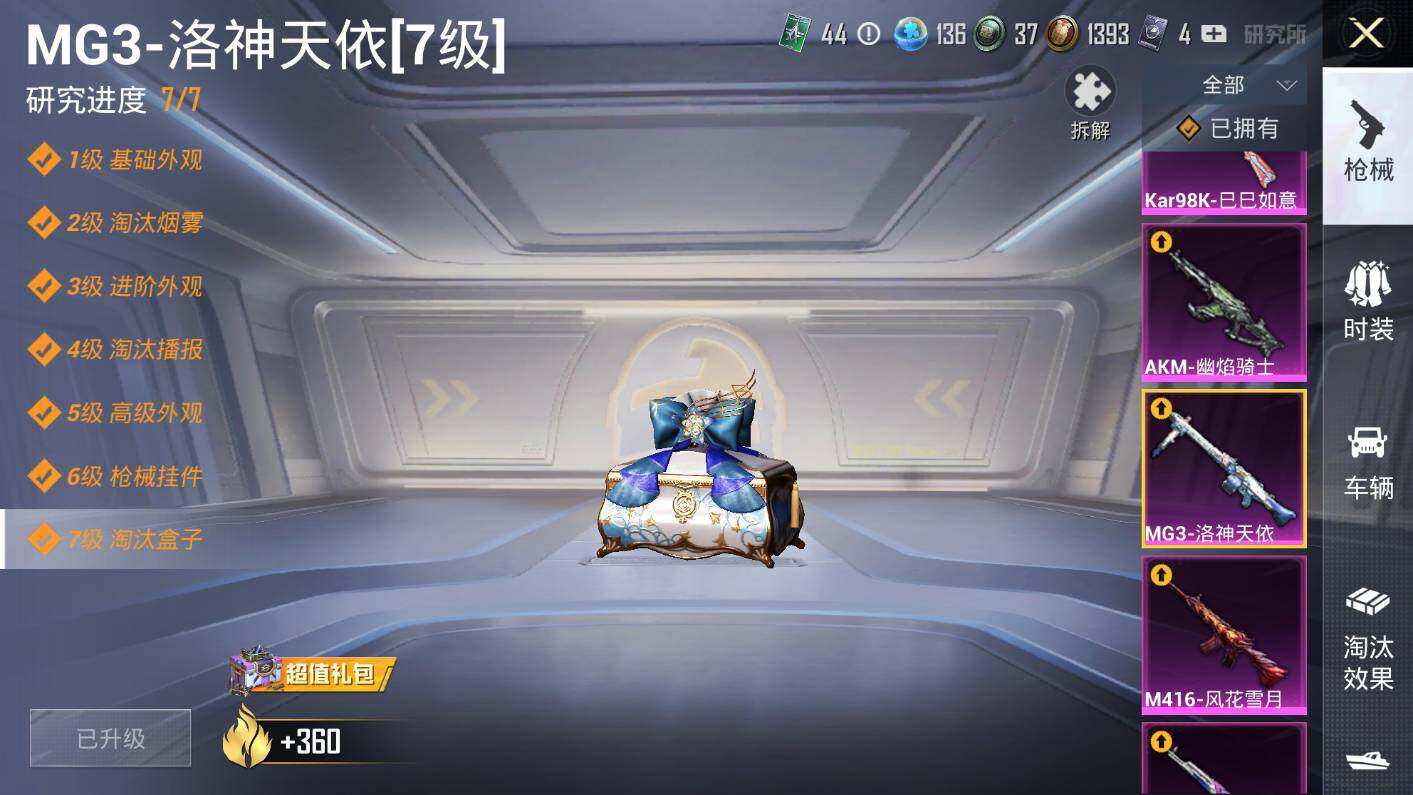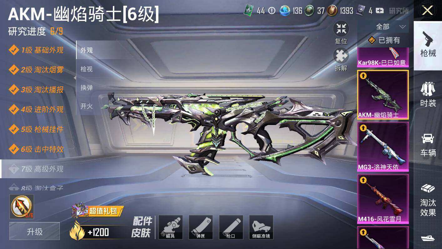 【粉色枪皮等级】:AKM-梦之光华(六级),AKM-幽焰骑士(六级),M416-风花雪月(七级),Kar98K-巳巳如意(五级),MG3-洛神天依(七级)