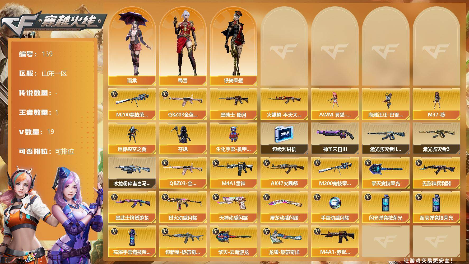 [12209206]【139】18V/102级/荣耀元首/1王者/1英雄/QBZ03-金色蔷薇/M200-竞技荣光/火麒麟-平天大圣/黑骑士-暗月/雨棠/蜀雪/铁骑荣耀/AWM-灵狐-15周年嘉年华/海滩汪汪-巴雷特/M37-葵/迷你裂空之翼/夺魂/生化手雷-机甲核心/超级对讲机/神圣爆裂者-末日/激光毁灭者/激光毁灭者III-白马银枪/冰龙粉碎者-白马银枪/擎天-竞技荣光/高爆手雷-竞技荣光/烟雾弹-竞技荣光/闪光弹-竞技荣光/烈火-动感闪耀/天神-动感闪耀/屠龙-动感闪耀/手雷-动感闪耀/无影-神兵利器/M4A1-雷神/AK47-火麒麟/AK47-黑武士-锦绣游龙/超新星-热带奇洋/M4A1-赤狱骑士/擎天-云海游龙/龙啸-热带奇洋