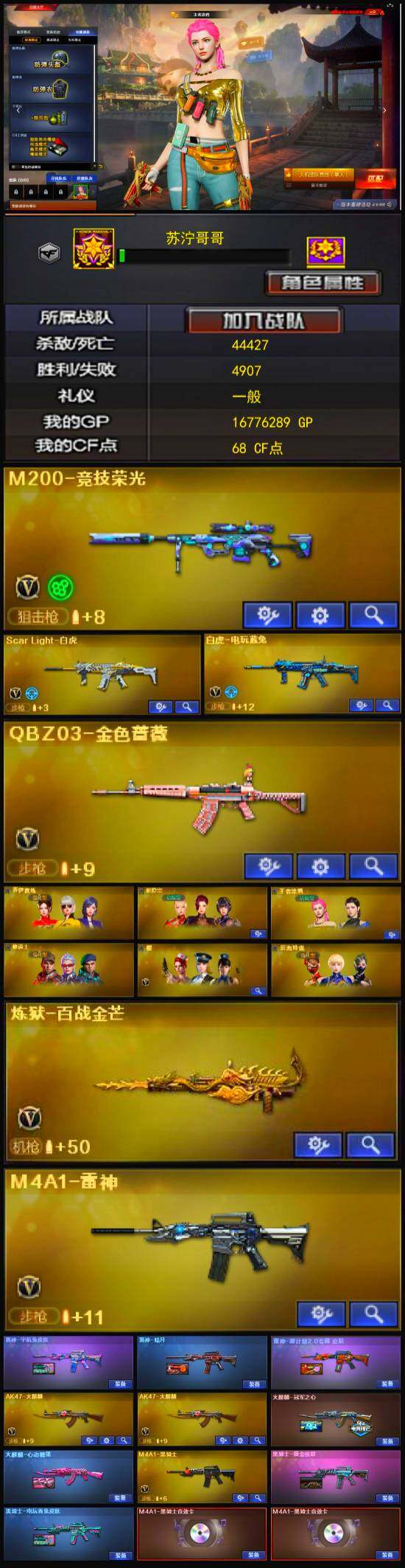 - [12466626]【商品标题】:北方大区-32V-3王者-0炫金 【传说武器】:传说灵眸 【热门武器】:传说灵眸,加特林-炼狱,COP 357-幻灵,沙鹰-修罗*3 【王者炫金武器】:王者之霆 【稀有皮肤】:雷神-虎将,火麒麟-心动糖果 【角色】:晴雅,战地猎狐,青霞仙子 【人偶武器】:AWM-灵狐-15周年嘉年华 【暴走生化】:超级对讲机 【挑战大师】:神圣爆裂者-末日III*2 【英雄级武器】:COP 357-幻灵,无影-神兵利器,M4A1-雷神,M4A1-黑龙,加特林-炼狱,AK47-黑武士,Barrett-毁灭,AWM-裁决,AA-12-雷霆,黑武士-锦绣游龙,超新星-热带奇洋,死神-雪域霜狐,M4A1-赤狱骑士,USP-冥王*2,沙鹰-天神,沙鹰-修罗*3,擎天*3,屠龙,龙啸-热带奇洋 【特殊枪械】:1炼狱