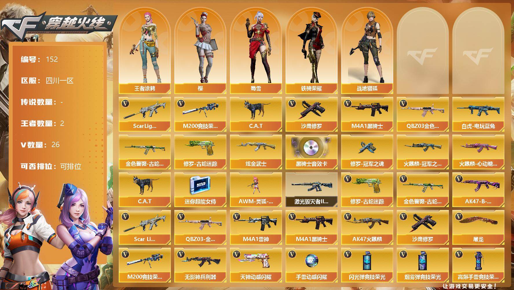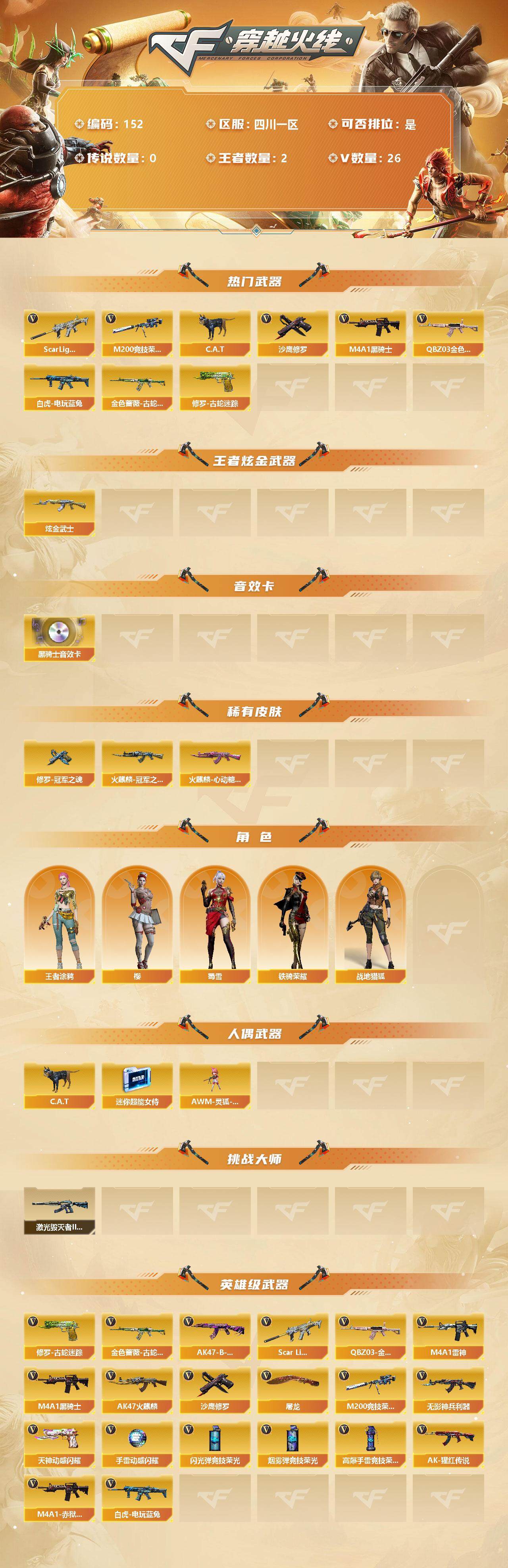 [12209194]【152】22V/102级/荣耀元首/2王者/1炫金/4英雄/QBZ03-金色蔷薇/Scar Light-白虎/金色蔷薇-古蛇迷踪/修罗-古蛇迷踪/M200-竞技荣光/白虎-电玩蓝兔/C.A.T/M4A1-黑骑士/沙鹰-修罗/炫金黑武士/M4A1-黑骑士音效卡/火麒麟-冠军之心/火麒麟-心动糖果/修罗-冠军之魂/王者涂鸦/樱/战地猎狐/蜀雪/铁骑荣耀/AWM-灵狐-15周年嘉年华/迷你超能女侍/激光毁灭者III-白马银枪/高爆手雷-竞技荣光/烟雾弹-竞技荣光/闪光弹-竞技荣光/天神-动感闪耀/手雷-动感闪耀/无影-神兵利器/M4A1-雷神/AK47-火麒麟/AK-47-猩红传说/AK47-B-常胜将军/M4A1-赤狱骑士/屠龙