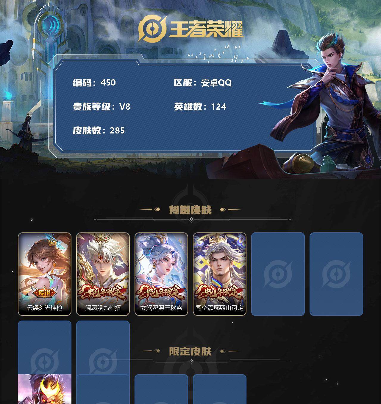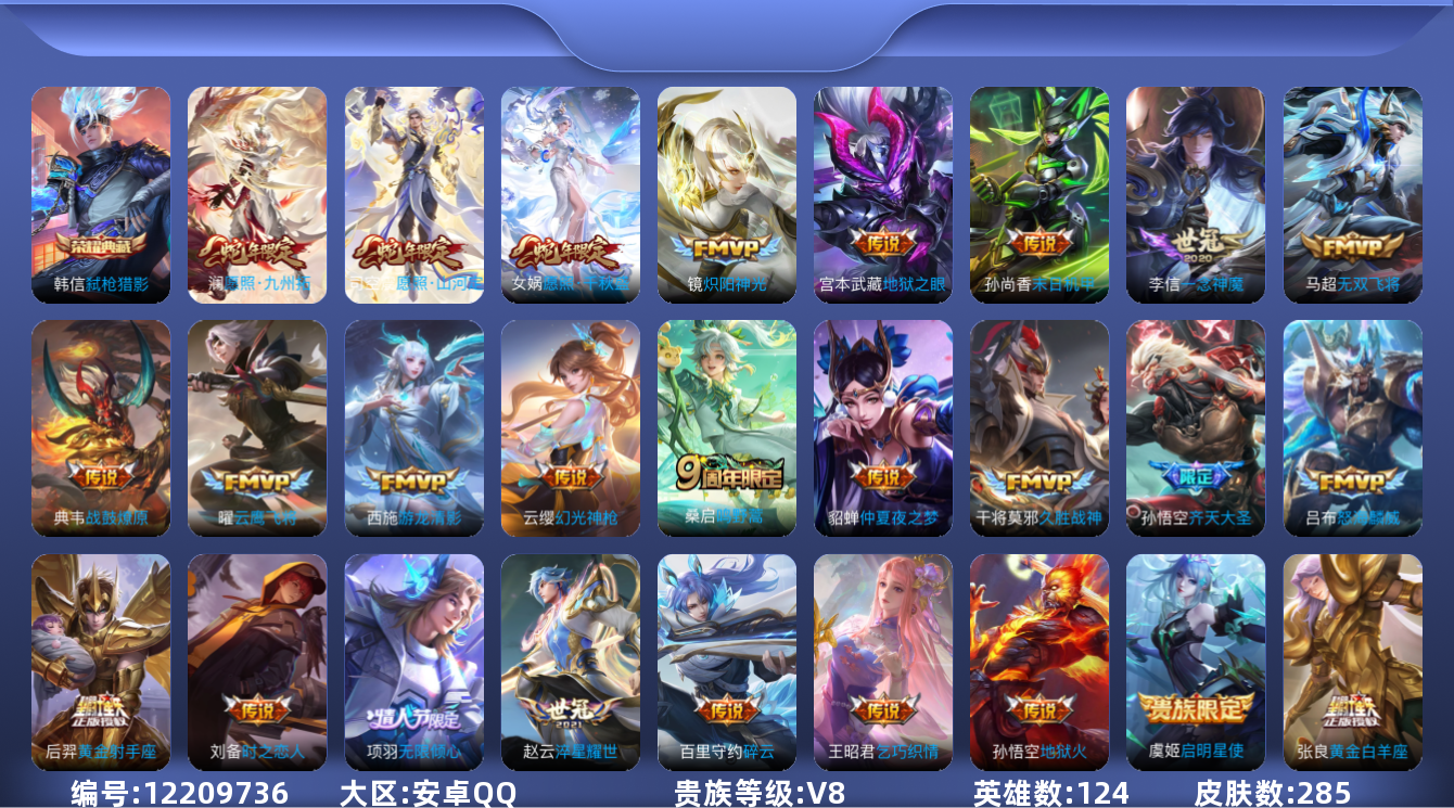 [12209736]【商品标题】:安卓Q-V8-永恒钻石IV段位-124英雄-285皮肤-1典藏-0珍品无双-0无双-0珍品传说-26传说-78史诗