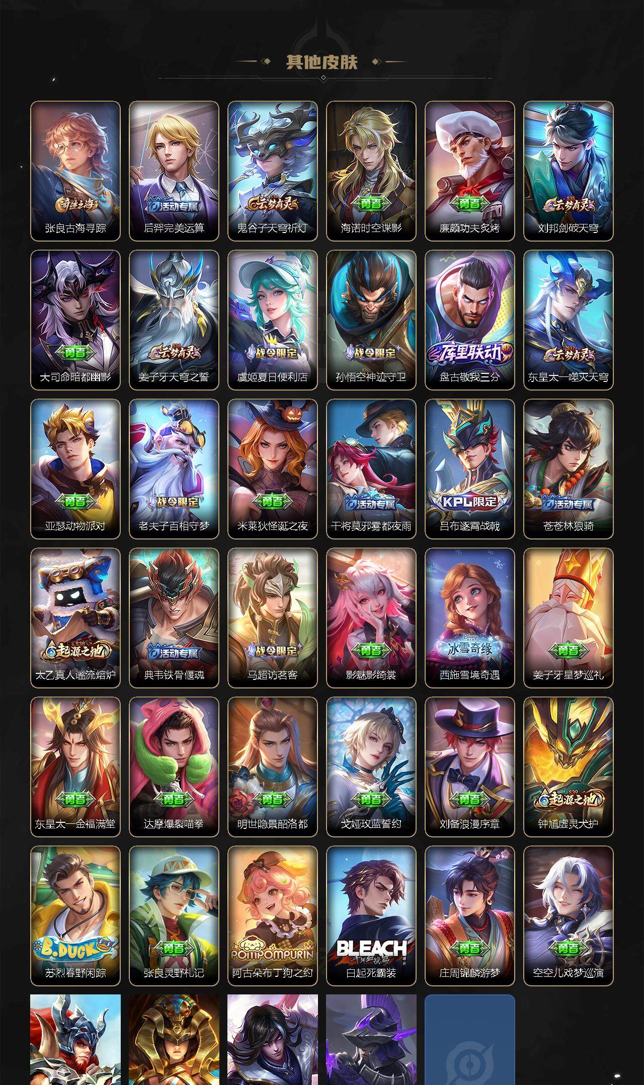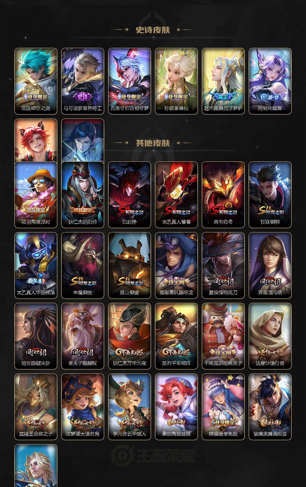 【限定皮肤】:白起狰,蔡文姬夏日便利店,大乔绒语心约,虞姬夏日便利店,姜子牙天穹之誓,狄仁杰阴阳师,赵云皇家上将,赵云龙胆,庄周高山流水,高渐离玩趣恶龙,元歌无心,夏侯惇朔风刀,夏侯惇匿光决锋者,甄姬游园惊梦,典韦穷奇,马可波罗山海玄木吟,狄仁杰魔术师,狄仁杰万华元夜,达摩沙漠行僧,项羽海滩派对,项羽无限倾心,老夫子醍醐杖,韩信飞衡,兰陵王金庭之子,孙悟空至尊宝,孙悟空齐天大圣,牛魔御旌,李元芳云中旅人,虞姬启明星使,干将莫邪胡桃夹子,太乙真人饕餮,太乙真人华丽摇滚,鬼谷子五谷丰年,苏烈千军破阵,百里玄策原初追逐者,弈星混沌棋,梦奇顽趣,沈梦溪大漠名商,明世隐疑决卦,裴擒虎李小龙,裴擒虎擒涛扼浪,狂铁御狮,云中君纤云弄巧,盾山御銮,上官婉儿梁祝,嫦娥拒霜思,嫦娥暖冬兔眠,鲁班大师探海日志,桑启海盐诗旅,暃星界游侠,阿古朵江河有灵,张良古海寻踪,蒙犽百解令,鬼谷子天穹祈灯,沈梦溪龙舞盛年,刘邦剑破天穹,刘备异域游侠