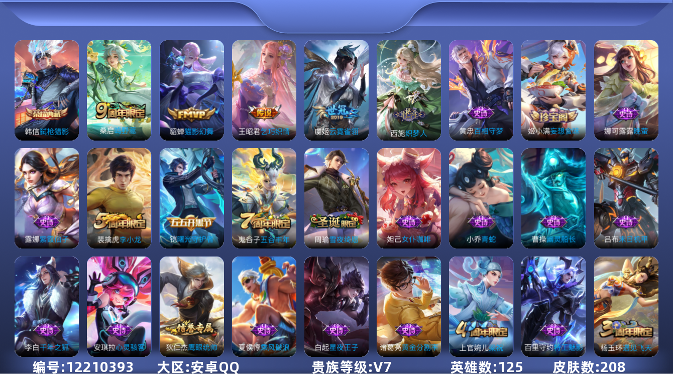 [12210393]【特价急出/详情看图】:安卓Q-V7-至尊星耀III段位-125英雄-208皮肤-1典藏-4传说-43史诗