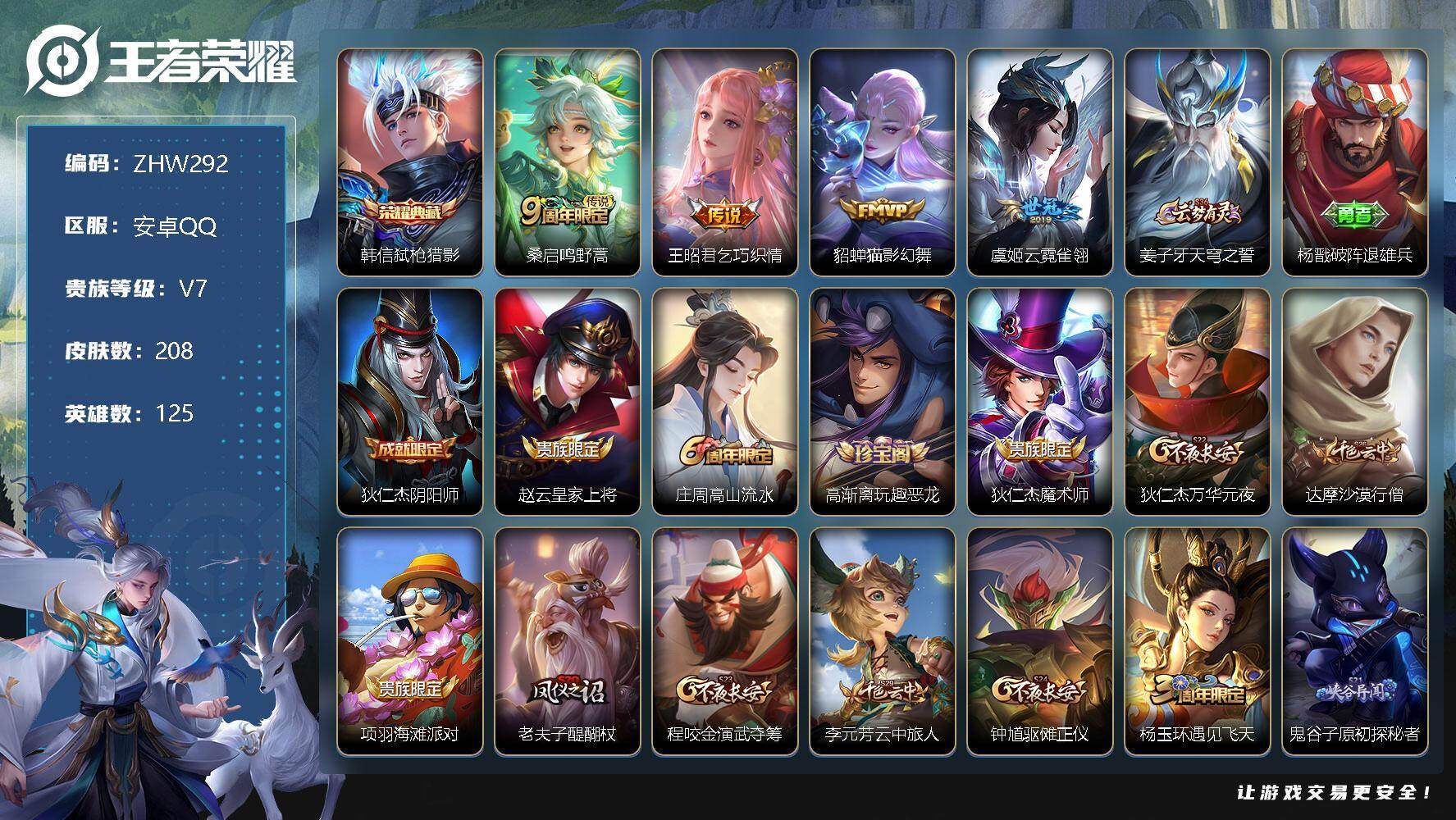 [12210393]【特价急出/详情看图】:安卓Q-V7-至尊星耀III段位-125英雄-208皮肤-1典藏-4传说-43史诗 【荣耀典藏】:韩信弑枪猎影 【传说皮肤】:桑启鸣野蒿,王昭君乞巧织情,貂蝉猫影幻舞,虞姬云霓雀翎 【限定皮肤】:姜子牙天穹之誓,杨戬破阵退雄兵,狄仁杰阴阳师,赵云皇家上将,庄周高山流水,高渐离玩趣恶龙,狄仁杰魔术师,狄仁杰万华元夜,达摩沙漠行僧,项羽海滩派对,老夫子醍醐杖,程咬金演武夺筹,李元芳云中旅人,钟馗驱傩正仪,杨玉环遇见飞天,鬼谷子原初探秘者,鬼谷子五谷丰年,苏烈千军破阵,弈星混沌棋,沈梦溪大漠名商,明世隐疑决卦,裴擒虎李小龙,裴擒虎擒涛扼浪,上官婉儿梁祝,鲁班大师探海日志,桑启海盐诗旅,阿古朵江河有灵,张良古海寻踪,鬼谷子天穹祈灯,姬小满妄想食味,沈梦溪龙舞盛年,刘邦剑破天穹,程咬金群星魔术团,周瑜熔金海岸 【赛季限定】:狄仁杰万华元夜,达摩沙漠行僧,老夫子醍醐杖,程咬金演武夺筹,张良古海寻踪,李元芳云中旅人,钟馗驱傩正仪,鬼谷子原初探秘者,苏烈千军破阵,弈星混沌棋,沈梦溪大漠名商,明世隐疑决卦,裴擒虎擒涛扼浪,鲁班大师探海日志,桑启海盐诗旅,鬼谷子天穹祈灯,刘邦剑破天穹,姜子牙天穹之誓 【史诗皮肤】:露娜紫霞仙子,赵云皇家上将,貂蝉圣诞恋歌,狄仁杰魔术师,宫本武藏鬼剑武藏,孙尚香水果甜心,嬴政摇滚巨星,妲己魅力维加斯,妲己女仆咖啡,墨子金属风暴,刘禅绅士熊喵,曹操幽灵船长,李白千年之狐,吕布末日机甲,韩信白龙吟,刘邦德古拉伯爵,夏侯惇乘风破浪,兰陵王暗隐猎兽者,诸葛亮黄金分割率,亚瑟心灵战警,雅典娜冰冠公主,安琪拉心灵骇客,百里守约特工魅影,铠曙光守护者,李元芳逐浪之夏,程咬金功夫厨神,白起星夜王子,杨玉环遇见飞天,孙策猫狗日记,大乔猫狗日记,伽罗箭羽风息,狄仁杰鹰眼统帅,上官婉儿梁祝,娜可露露晚萤,小乔青蛇,裴擒虎李小龙,庄周高山流水,鬼谷子五谷丰年,阿古朵江河有灵,周瑜雪夜绮愿,姬小满妄想食味,黄忠百相守梦,西施织梦人 【其他皮肤】:项羽海滩派对,韩信教廷特使,韩信街头霸王,露娜哥特玫瑰,阿轲爱心护理,达摩大发明家,赵云白执事,赵云忍炎影,芈月红桃皇后,程咬金星际陆战队,白起白色死神,牛魔西部大镖客,武则天东方不败,扁鹊化身博士,扁鹊救世之瞳,庄周鲤鱼之梦,安琪拉玩偶对对碰,姜子牙时尚教父,妲己少女阿狸,花木兰兔女郎,张飞五福同心,甄姬花好人