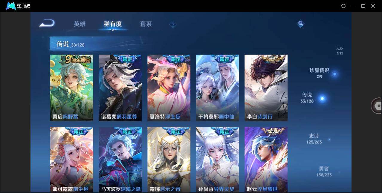 - [12296529]V6 1典藏 1珍品传说 5传说 125英雄 187皮肤 可修改实名 优质装备:幻阙歌(貂蝉典藏),一念神魔 珍品传说:兔狲·蓬尾 传说皮:幻光神枪 珍宝阁皮:妄想食味 限定皮:愿照·九州拓(澜年限),愿照·山河定(司空震年限),逐霄战戟,鸣野蒿,孙行者 史诗皮:器灵·浮梦炉,化蝶舞,龙之律动,雪豹·霜爪,茶境仙,炽弈燎原,破空之剑,战舞者,蒙犽顽岩魄,决胜骁骑,蔬乡物语(鲁班七号),百相守梦-百里守约,百相守梦-黄忠,织梦人,特工魅影,千年之狐,江河有灵,百解令(蒙犽),高渐离燃音魔法,青蛇,末日机甲-吕布,猫狗日记-孙策,女仆咖啡,水果甜心,星夜王子,功夫厨神,幽灵船长,鬼剑武藏,心灵战警,舞动绿茵,纤云弄巧,拒霜思,逐浪之夏,水晶猎龙者,曙光守护者,圣诞恋歌,鹰眼统帅,魅力维加斯,未来纪元-赵云