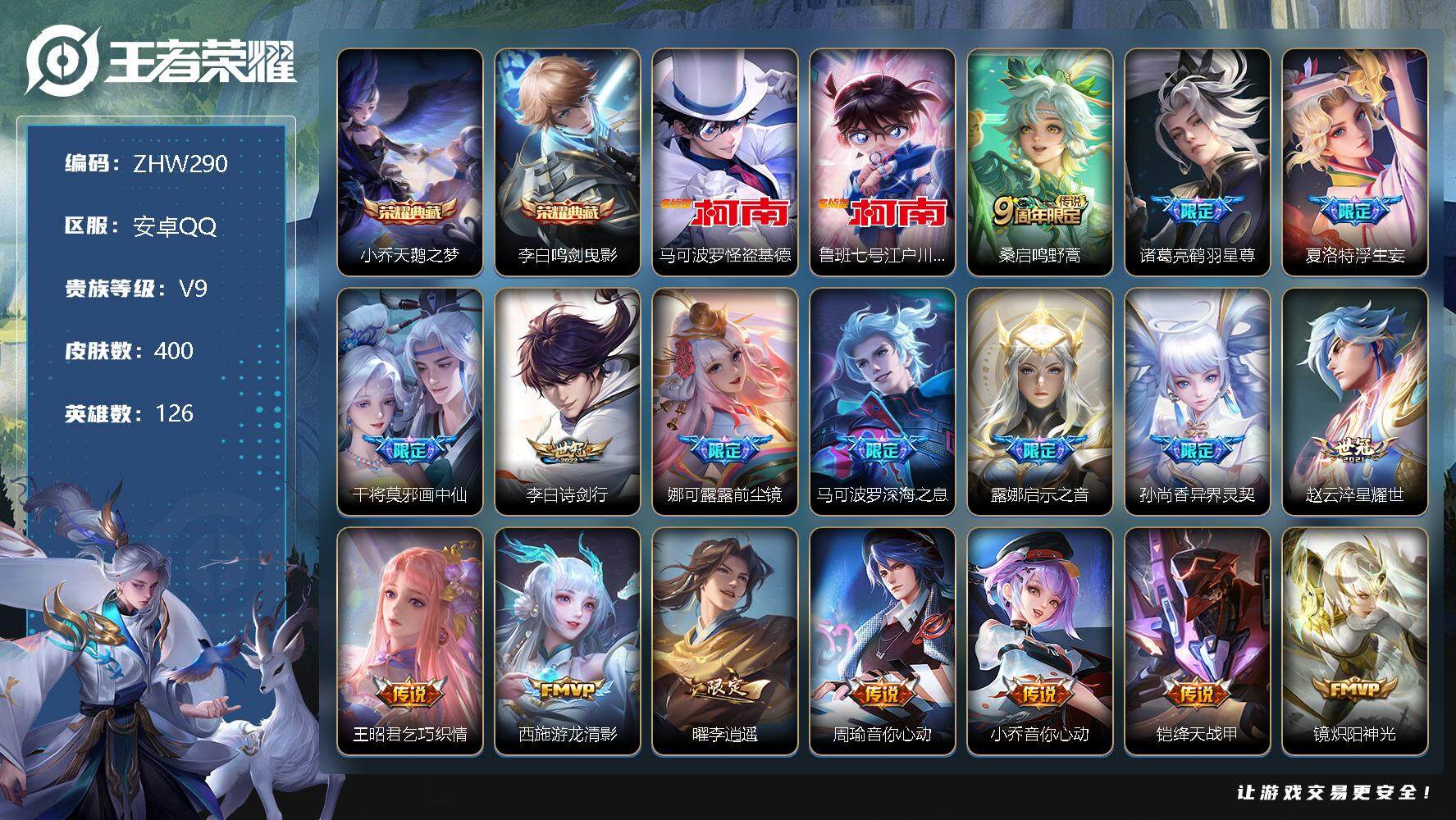 [12210407]【特价急出/详情看图】:安卓Q-V9-至尊星耀V段位-126英雄-400皮肤-2典藏-2珍品传说-33传说-125史诗 【荣耀典藏】:小乔天鹅之梦,李白鸣剑曳影 【珍品传说】:马可波罗怪盗基德,鲁班七号江户川柯南 【传说皮肤】:桑启鸣野蒿,诸葛亮鹤羽星尊,夏洛特浮生妄,干将莫邪画中仙,李白诗剑行,娜可露露前尘镜,马可波罗深海之息,露娜启示之音,孙尚香异界灵契,赵云淬星耀世,王昭君乞巧织情,西施游龙清影,曜李逍遥 ,周瑜音你心动,小乔音你心动,铠绛天战甲,镜炽阳神光,虞姬启明星使,关羽武圣,曜云鹰飞将,李信一念神魔,刘备时之恋人,貂蝉猫影幻舞,干将莫邪久胜战神,虞姬云霓雀翎,达摩黄金狮子座,花木兰冠军飞将,梦奇胖达荣荣,后羿黄金射手座,貂蝉仲夏夜之梦,孙尚香末日机甲,宫本武藏地狱之眼,孙悟空地狱火 【限定皮肤】:白起狰,姜子牙天穹之誓,狄仁杰阴阳师,赵云皇家上将,墨子神迹守卫,墨子降魔,妲己热情桑巴,嬴政优雅恋人,嬴政白昼王子,孙尚香蔷薇恋人,孙尚香异界灵契,庄周高山流水,孙膑天狼运算者,扁鹊奇幻香踪,白起夜都怪侠,芈月白晶晶,芈月幻夜卜梦,吕布猎兽之王,吕布御风骁将,周瑜赤莲之焰,元歌云间偶戏,元歌无心,夏侯惇朔风刀,夏侯惇匿光决锋者,甄姬女儿国国王,曹操天狼征服者,典韦穷奇,典韦蓝屏警告,马可波罗逐梦之星,马可波罗深海之息,狄仁杰魔术师,狄仁杰万华元夜,达摩星际陆战队,达摩沙漠行僧,项羽海滩派对,老夫子醍醐杖,老夫子航海奇遇记,关羽冰锋战神,关羽武圣,程咬金演武夺筹,露娜一生所爱,露娜启示之音,韩信飞衡,韩信傲雪梅枪,王昭君凤凰于飞,兰陵王驯魔猎人,兰陵王金庭之子,花木兰默契交锋,娜可露露前尘镜,亚瑟潮玩骑士王,孙悟空至尊宝,孙悟空孙行者,牛魔御旌,后羿圣弓游侠,张飞虎魄,李元芳云中旅人,虞姬启明星使,钟馗驱傩正仪,杨玉环遇见飞天,杨戬潮玩骑兵,女娲朔望之晖,干将莫邪冰霜恋舞曲,干将莫邪胡桃夹子,干将莫邪真爱魔法,干将莫邪画中仙,雅典娜单词大作战,雅典娜黎明之约,蔡文姬繁星吟游,太乙真人饕餮,鬼谷子原初探秘者,鬼谷子五谷丰年,诸葛亮鹤羽星尊,黄忠烈魂,黄忠火炮绅士,苏烈千军破阵,百里玄策原初追逐者,百里守约朱雀志,弈星混沌棋,沈梦溪大漠名商,明世隐疑决卦,明世隐吟游魔法,裴擒虎李小龙,裴擒虎擒涛扼浪,狂铁御狮,米莱狄御霄,米莱狄胡桃异想国,云中君纤云弄巧,盾山御