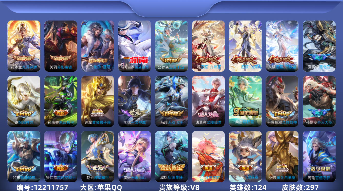 [12211757]【商品标题】:苹果Q-V8-至尊星耀II段位-124英雄-297皮肤-2典藏-0珍品无双-0无双-2珍品传说-22传说-78史诗