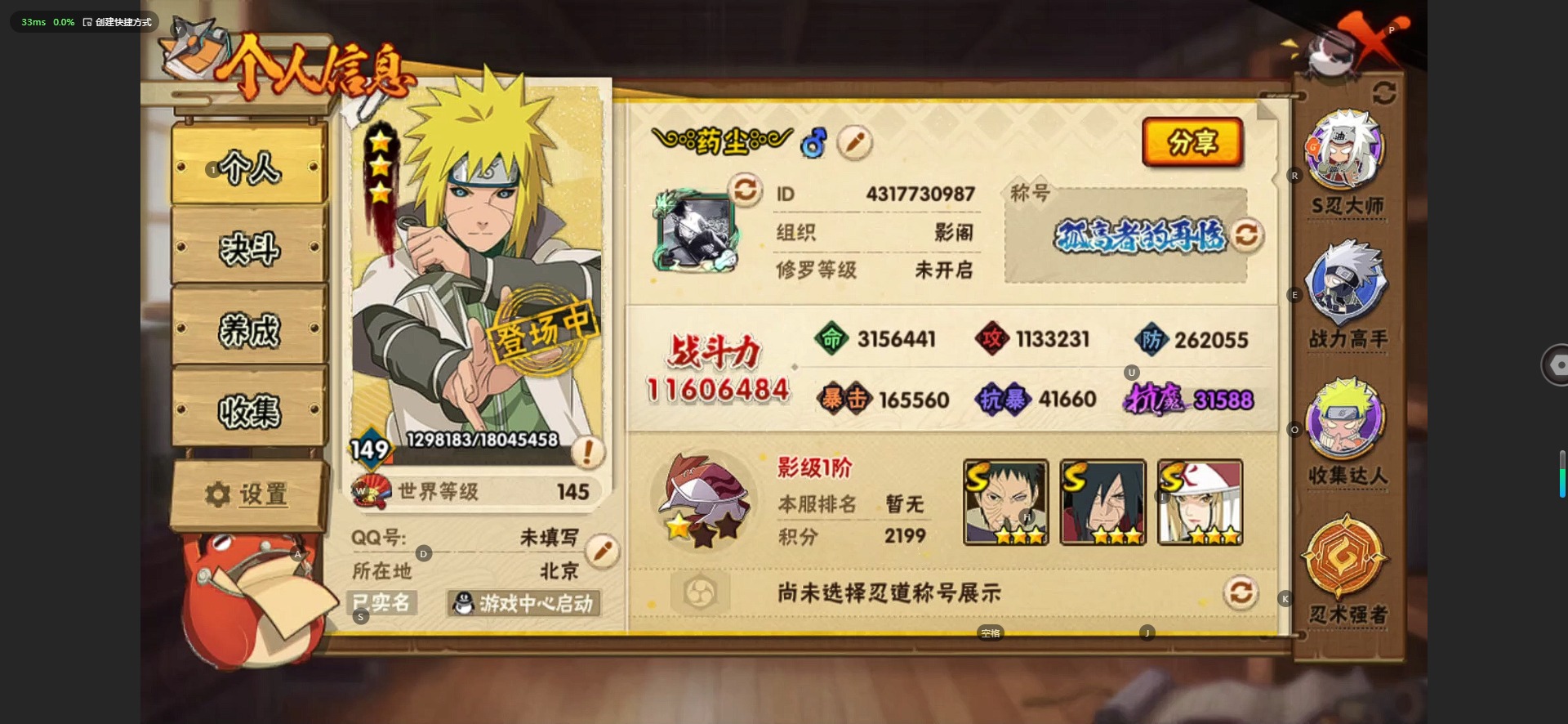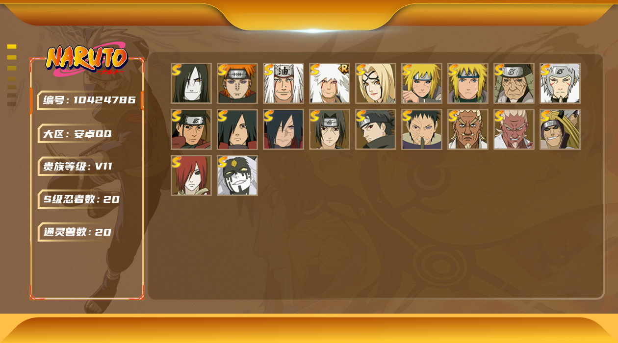 [10424786]V11 20S忍 35A忍 20通灵 1160W战力 可二次 可修改实名 S级忍者:宇智波止水「须佐能乎」,艾「忍界大战」,大筒木桃式,宇智波斑「秽土转生·解」,宇智波带土 「忍界大战」,自来也 「舞之豪杰」,纲手「百豪」,波风水门「秽土转生」,金角/银角「秽土转生」,猿飞日斩「秽土转生」,长门「秽土转生」,宇智波斑,千手柱间,艾「四代目雷影」,千手扉间,宇智波鼬 「须佐能乎」,佩恩「天道」,波风水门,大蛇丸,自来也