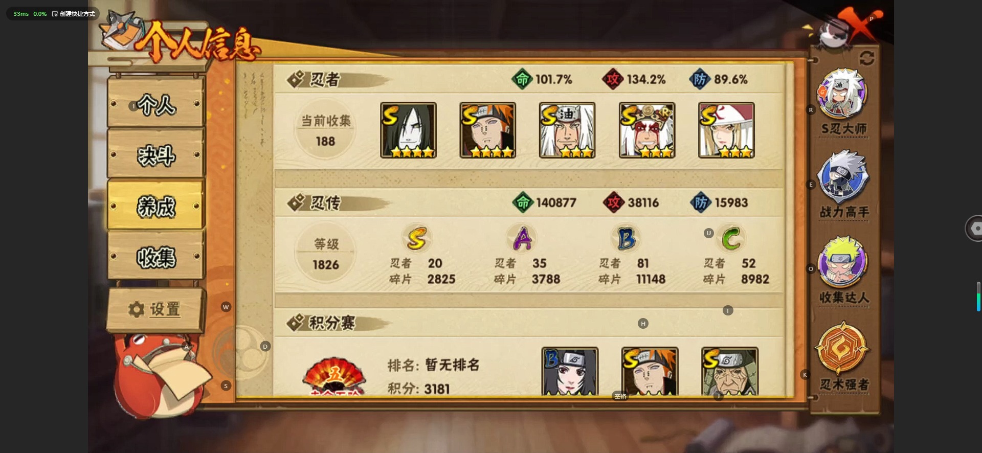 [12212247]V11 20S忍 35A忍 20通灵 1160W战力 可二次 可修改实名 优质装备:熊猫,纲手「百豪」,波风水门「秽土转生」,金角/银角「秽土转生」,猿飞日斩「秽土转生」,长门「秽土转生」,宇智波斑,千手柱间,艾「四代目雷影」,千手扉间,宇智波带土 「忍界大战」,宇智波斑「秽土转生·解」,大筒木桃式,艾「忍界大战」,宇智波止水「须佐能乎」 S级忍者:自来也 「舞之豪杰」,宇智波鼬 「须佐能乎」,佩恩「天道」,波风水门,大蛇丸,自来也