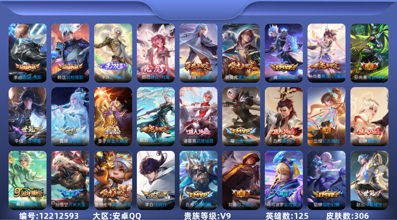 [12212593]【商品标题】:安卓Q-V9-永恒钻石I段位-125英雄-306皮肤-2典藏-0珍品无双-2无双-0珍品传说-28传说-91史诗
