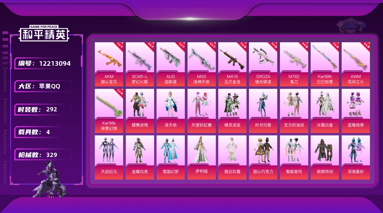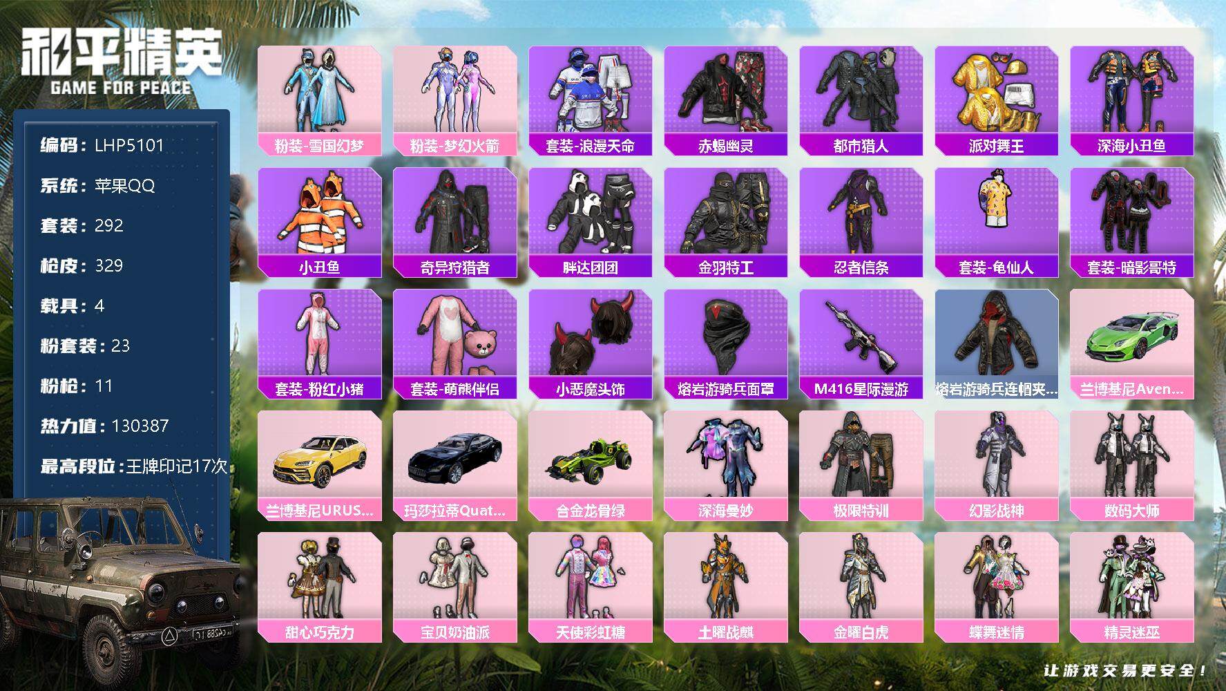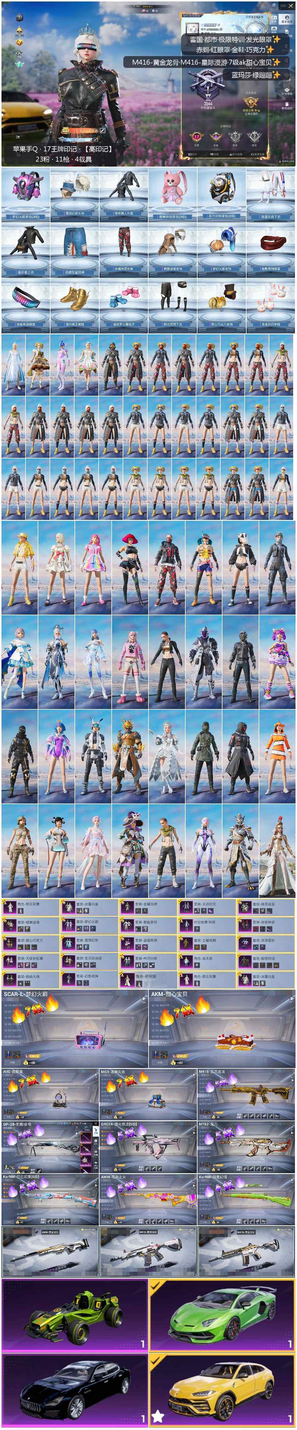 [12213094]素材身法号/地铁满天赋【特价急出/详情看图】:苹果 手Q-23粉装-11特效枪-4载具-6粉色飞行器-13w热力值-17王牌印记-292套装-329枪皮【热门品类】:粉装-雪国幻梦,粉装-梦幻火箭,套装-浪漫天命,套装-赤蝎幽灵,套装-都市猎人,套装-派对舞王,套装-深海小丑鱼,套装-小丑鱼,套装-奇异狩猎者,套装-胖达团团,套装-金羽特工,套装-忍者信条,套装-龟仙人,套装-暗影哥特,套装-粉红小猪,套装-萌熊伴侣,小恶魔头饰,熔岩游骑兵面罩,M416-星际漫游,熔岩游骑兵连帽夹克【粉色载具】:兰博基尼Aventador SVJ(翡翠绿),兰博基尼URUS(明艳黄),玛莎拉蒂Quattroporte(夜幕蓝),合金龙骨(绿)【粉色套装】:粉装-深海曼妙,粉装-极限特训,粉装-幻影战神,粉装-数码大师,粉装-甜心巧克力,粉装-宝贝奶油派,粉装-天使彩虹糖,粉装-土曜战麒,粉装-金曜白虎,粉装-雪国幻梦,粉装-蝶舞迷情,粉装-精灵迷巫,粉装-梦幻火箭,粉装-天启纪元,粉装-智能音符,粉装-放客神游,粉装-冰霜白皇,角色-洛天依,粉装-吟月归客,粉装-蓝莓炮弹,角色-烟云彩露,角色-萨利娅【粉色枪皮等级】:AKM-甜心宝贝(七级),SCAR-L-梦幻火箭(七级),M416-五爪金龙(五级),GROZA-镜光银凌(五级),AUG-超新星(七级),M762-鬼刀(五级),Kar98K-绿意幻情(四级),Kar98K-巳巳如意(五级),AWM-花间之火(五级),DP-28-豹影疾电(五级),MG3-洛神天依(七级)【粉色飞行器】:春暖花开飞行器,精灵迷巫飞行器,梦幻火箭飞行器